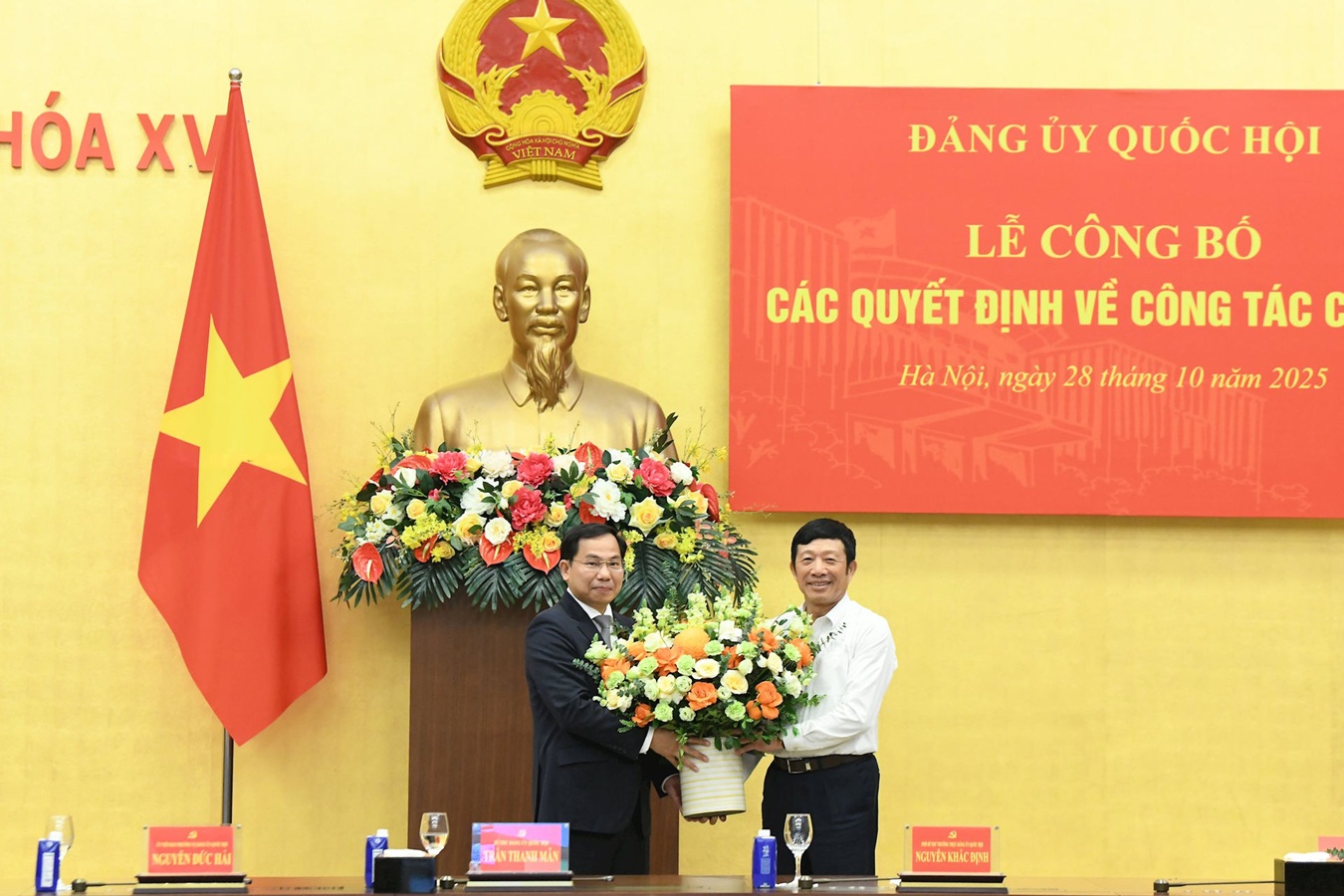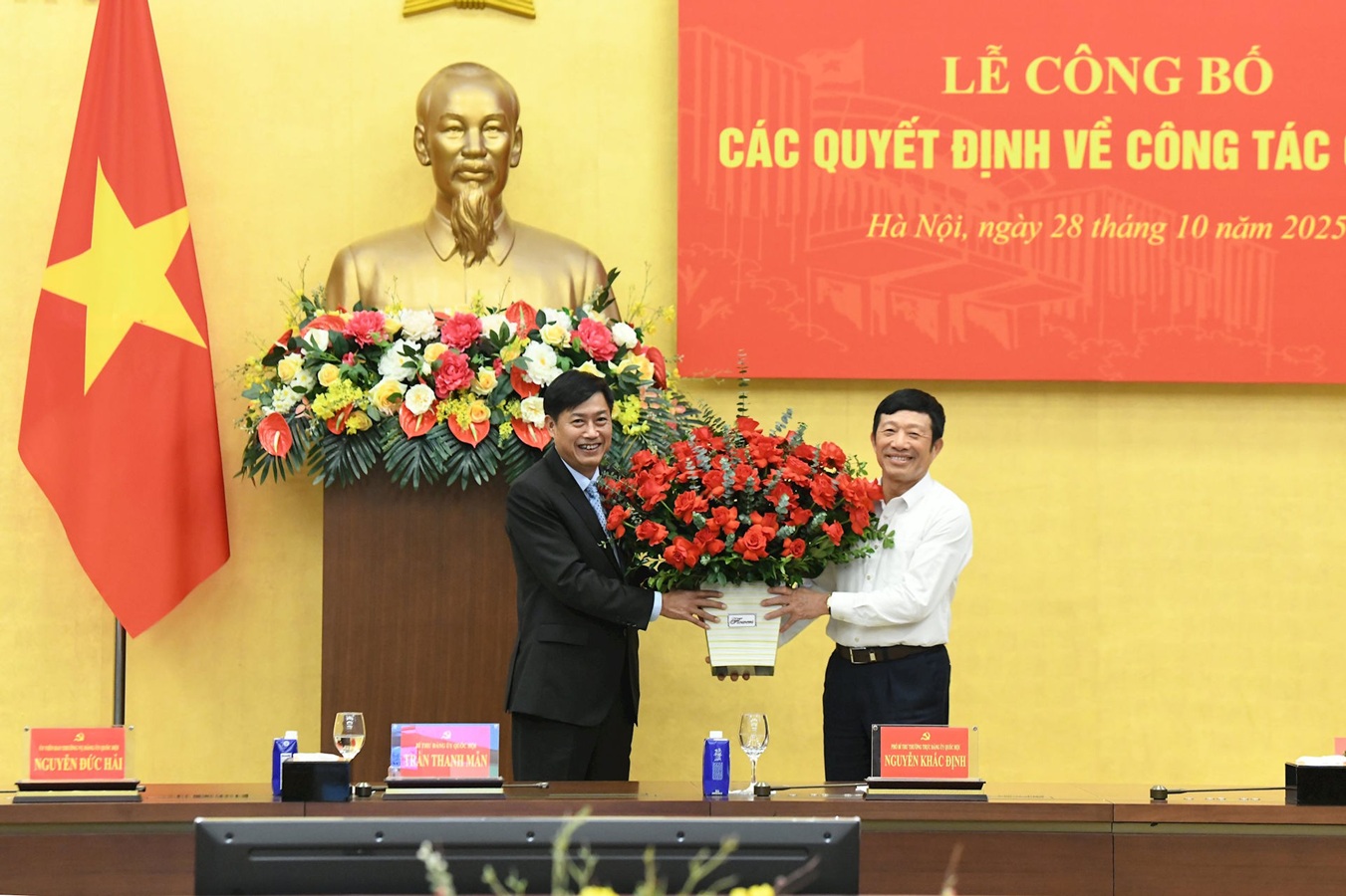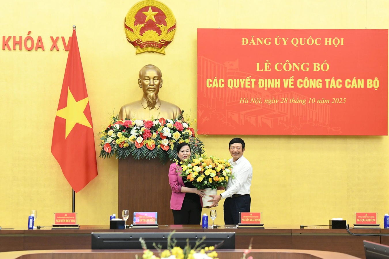 Thay mặt Đảng ủy Quốc hội, Bí thư Đảng ủy Quốc hội, Chủ tịch Quốc hội Trần Thanh Mẫn đã trao các quyết định; Phó Bí thư Đảng ủy Quốc hội, Phó Chủ tịch Quốc hội Nguyễn Khắc Định tặng hoa chúc mừng các đồng chí được bổ nhiệm.