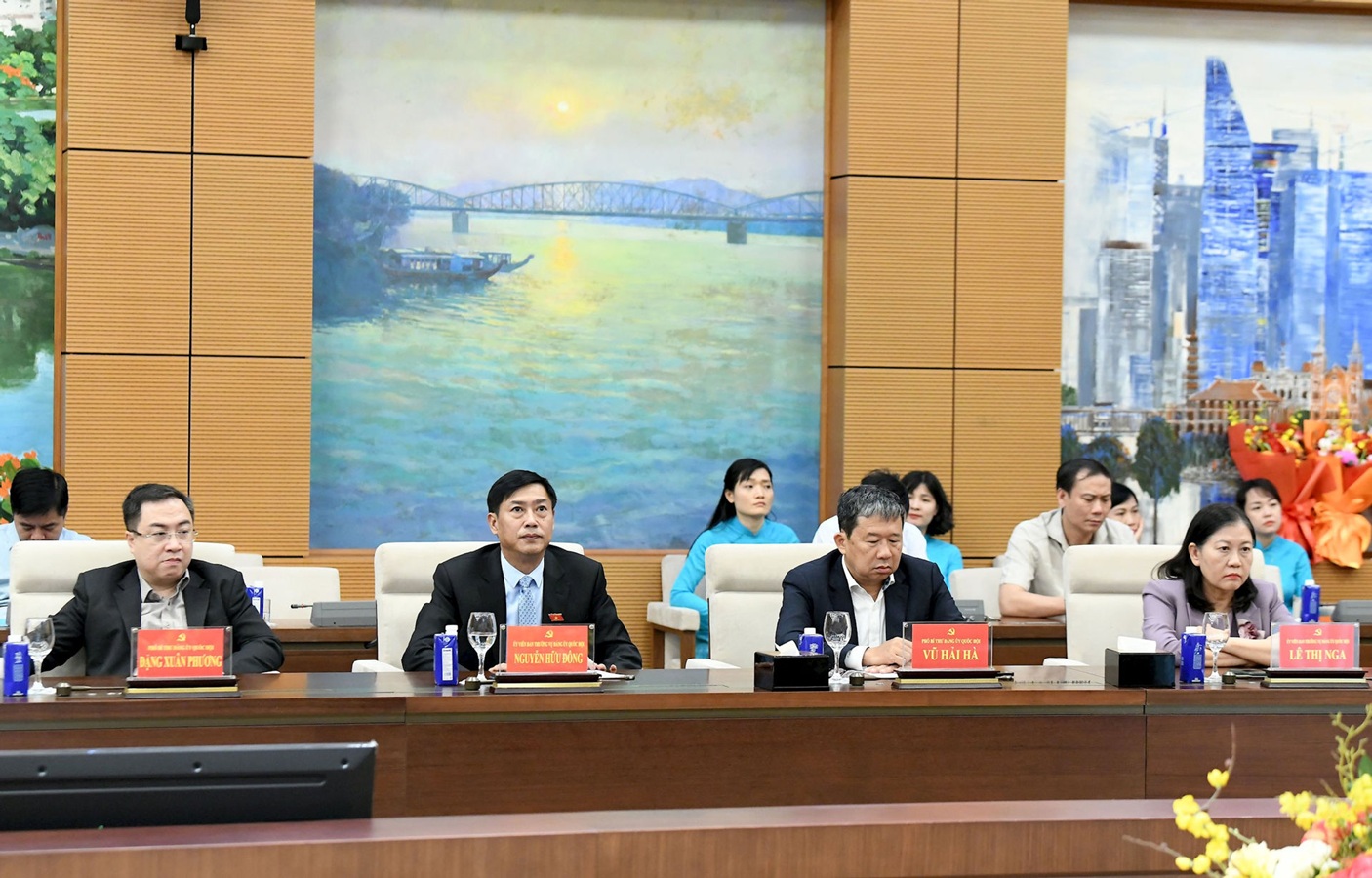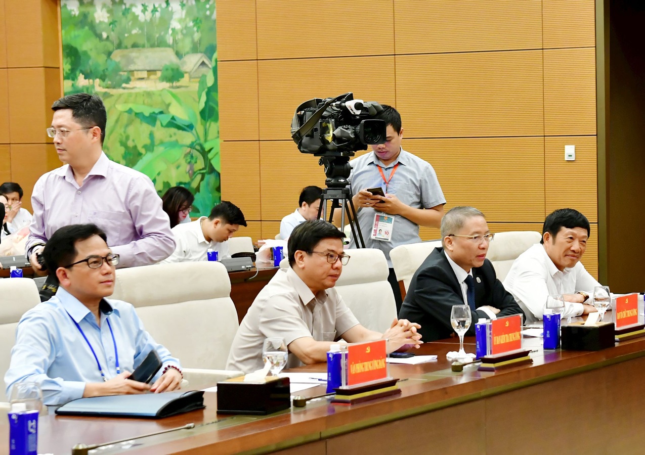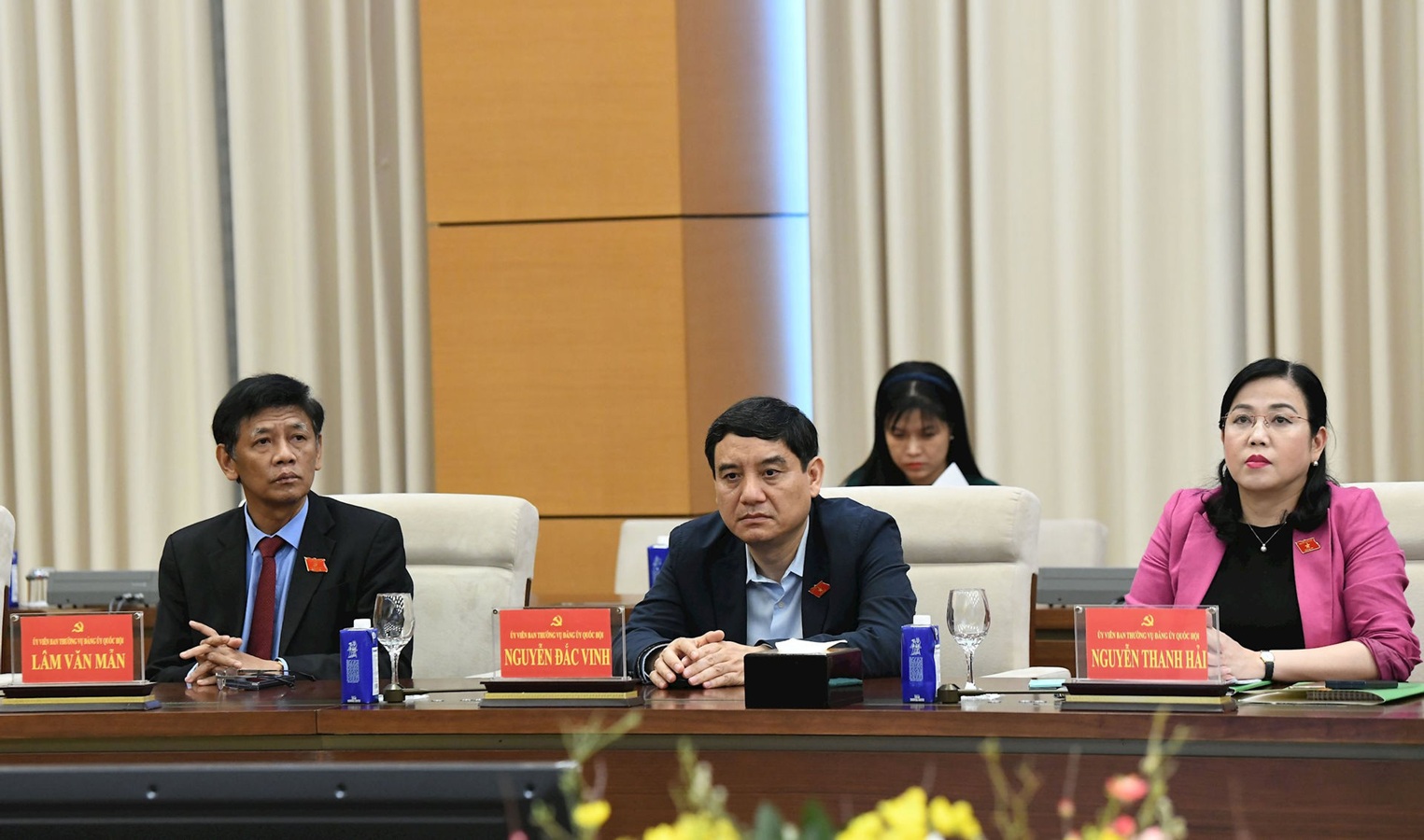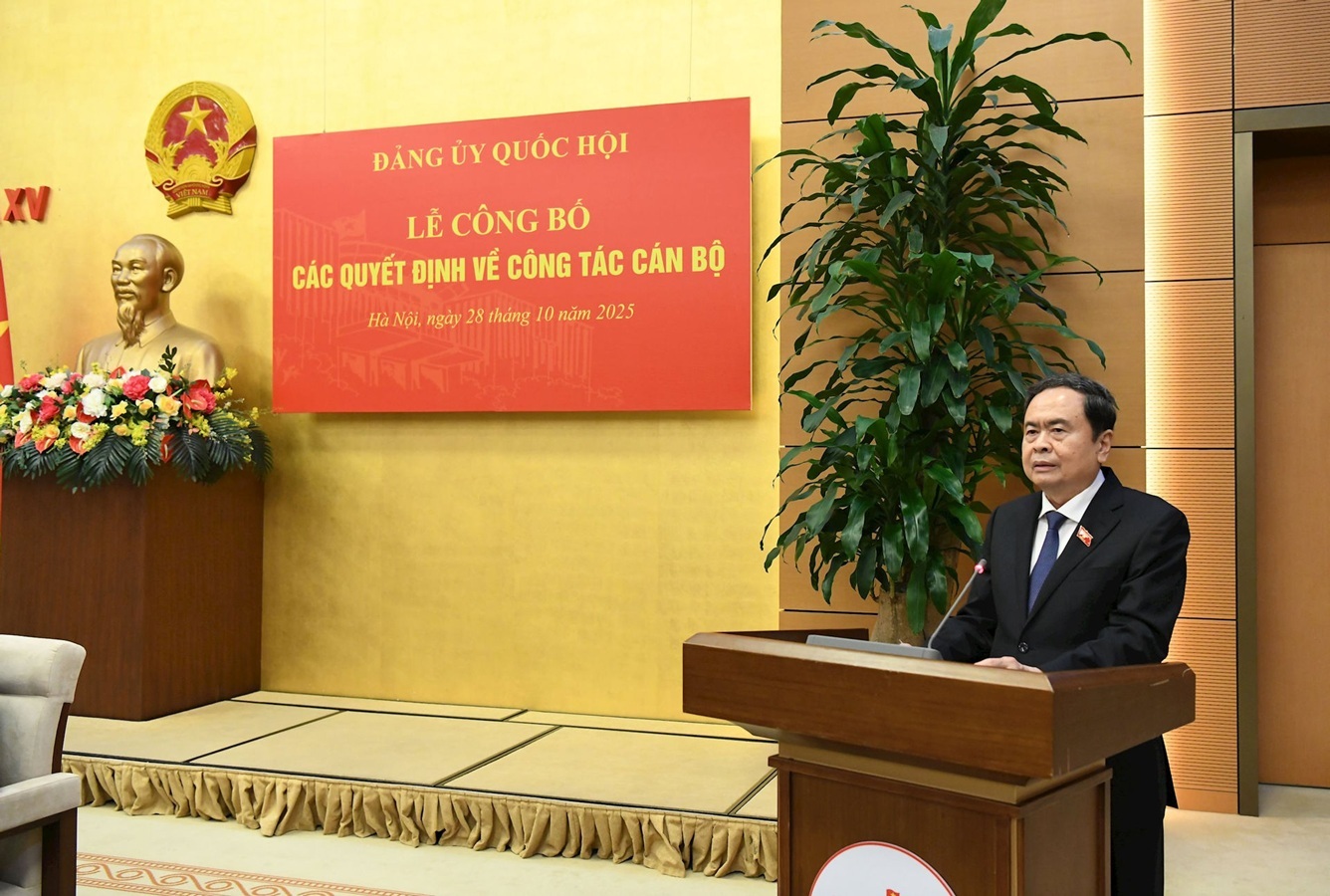 Thay mặt Đảng ủy Quốc hội, Bí thư Đảng ủy Quốc hội, Chủ tịch Quốc hội Trần Thanh Mẫn đã trao các quyết định; Phó Bí thư Đảng ủy Quốc hội, Phó Chủ tịch Quốc hội Nguyễn Khắc Định tặng hoa chúc mừng các đồng chí được bổ nhiệm.