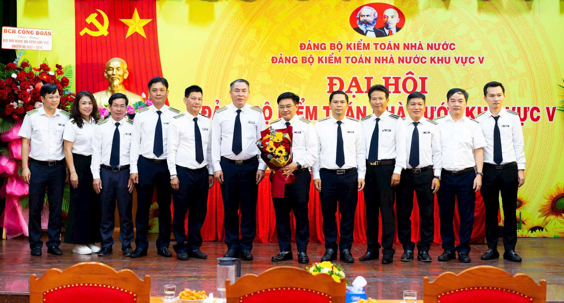 Lãnh đạo KTNN và các đại biểu chụp ảnh lưu niệm với Đảng bộ KTNN khu vực V và chúc mừng thành công Đại hội