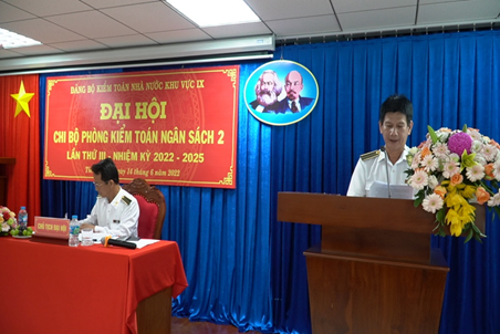 Chỉ đạo đại hội, Bí thư Đảng ủy KTNN khu vực IX Hoàng Bổng đề nghị trong nhiệm kỳ tới, các chi bộ tập trung xây dựng, củng cố tổ chức cơ sở đảng trong sạch, vững mạnh trên tất cả các lĩnh vực chính trị, tư tưởng, chuyên môn nghiệp vụ, đạo đức nghề nghiệp, góp phần thực hiện thắng lợi các mục tiêu do Nghị quyết Đại hội Đảng bộ KTNN và Nghị quyết Đại hội Đảng bộ KTNN khu vực IX, nhiệm kỳ 2022 -2025 đã đề ra. Quan tâm lãnh đạo chi bộ hoàn thành xuất sắc nhiệm vụ của phòng và của chi bộ, đặc biệt không ngừng nâng cao chất lượng kiểm toán góp phần Nâng cao năng lực hoạt động, hiệu lực pháp lý, chất lượng và hiệu quả hoạt động của KTNN như một công cụ hữu hiệu của Nhà nước trong kiểm tra, giám sát quản lý và sử dụng ngân sách, tiền và tài sản Nhà nước; xây dựng KTNN có trình độ chuyên nghiệp cao, từng bước hiện đại, trở thành cơ quan kiểm tra tài chính công có trách nhiệm và uy tín, đáp ứng yêu cầu của sự nghiệp công nghiệp hoá, hiện đại hoá đất nước, phù hợp với các thông lệ và chuẩn mực quốc tế”. Toàn đơn vị phấn đấu thi đua hoàn thành xuất sắc nhiệm vụ được giao hàng năm, đặc biệt năm 2022, thiết thực chào mừng kỷ niệm 15 năm thành lập KTNN khu vực IX (12/12/2007 – 12/12/2022)./.