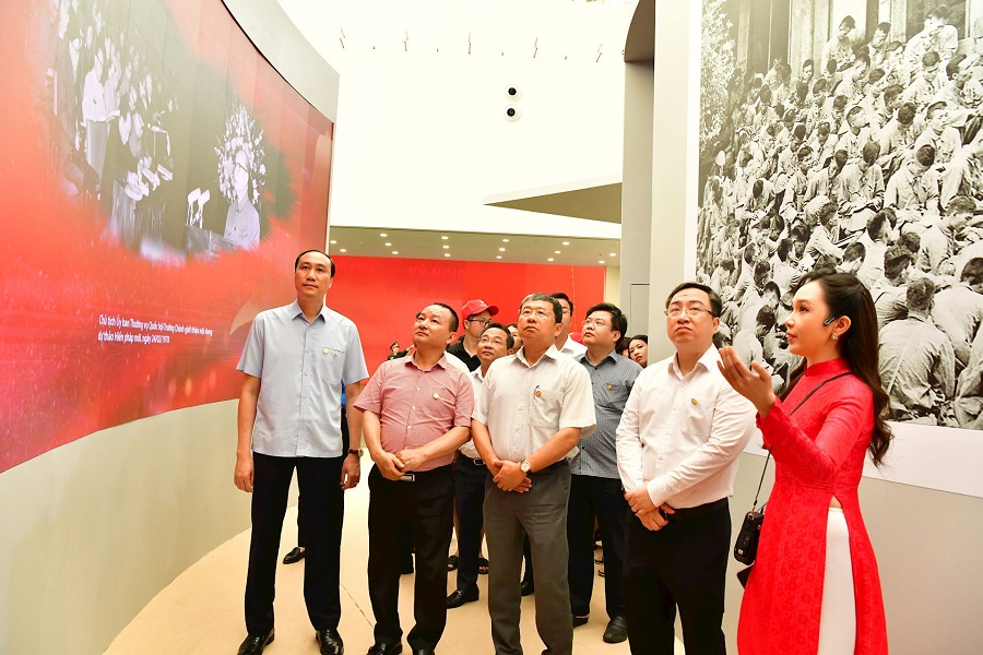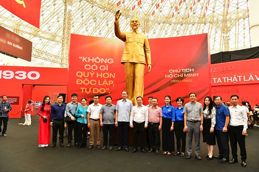 Tham quan Triển lãm chuyên đề “95 năm Cờ Đảng soi đường” - điểm nhấn đặc sắc tọa lạc tại vị trí trung tâm, Đoàn đại biểu đã chứng kiến toàn bộ không gian được thiết kế như một dòng chảy trải nghiệm, được thiết kế như một hành lang xoắn ốc, đi qua 6 phân khu trưng bày triển lãm, tái hiện hành trình lịch sử của dân tộc Việt Nam dưới lá cờ Đảng quang vinh. Đây là khu trưng bày hiện vật, hình ảnh, tư liệu văn hóa - chính trị đặc biệt, nhắc nhớ ý nghĩa thiêng liêng của ngọn cờ đỏ búa liềm - biểu tượng của lý tưởng, niềm tin và sức mạnh đại đoàn kết toàn dân.