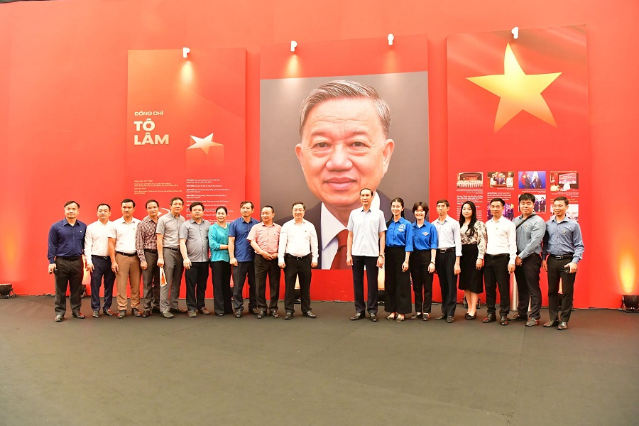 Đoàn đại biểu chụp ảnh lưu niệm dưới chân dung Tổng Bí thư Tô Lâm tại khu trưng bày về các Tổng Bí thư qua các thời kỳ