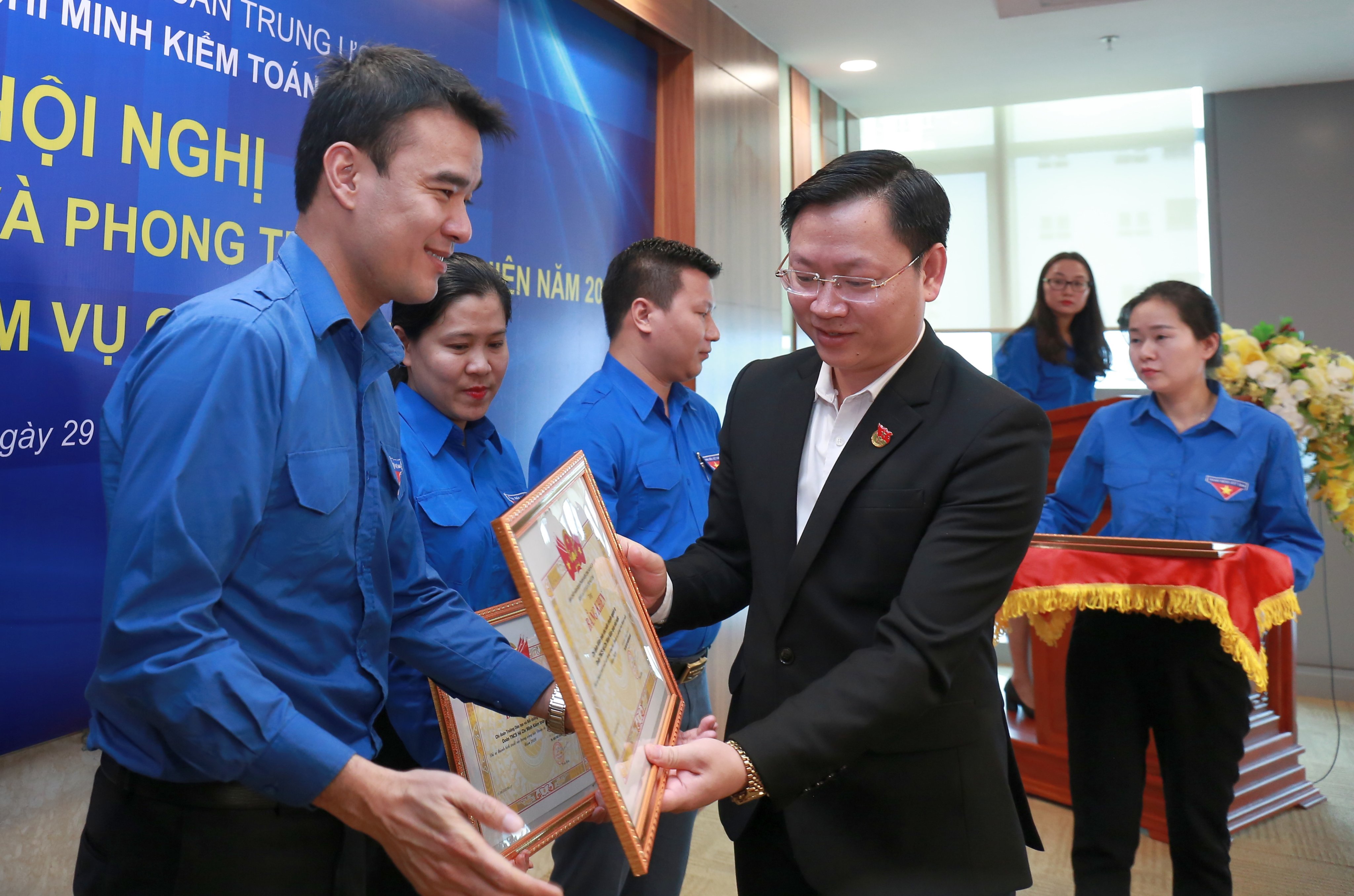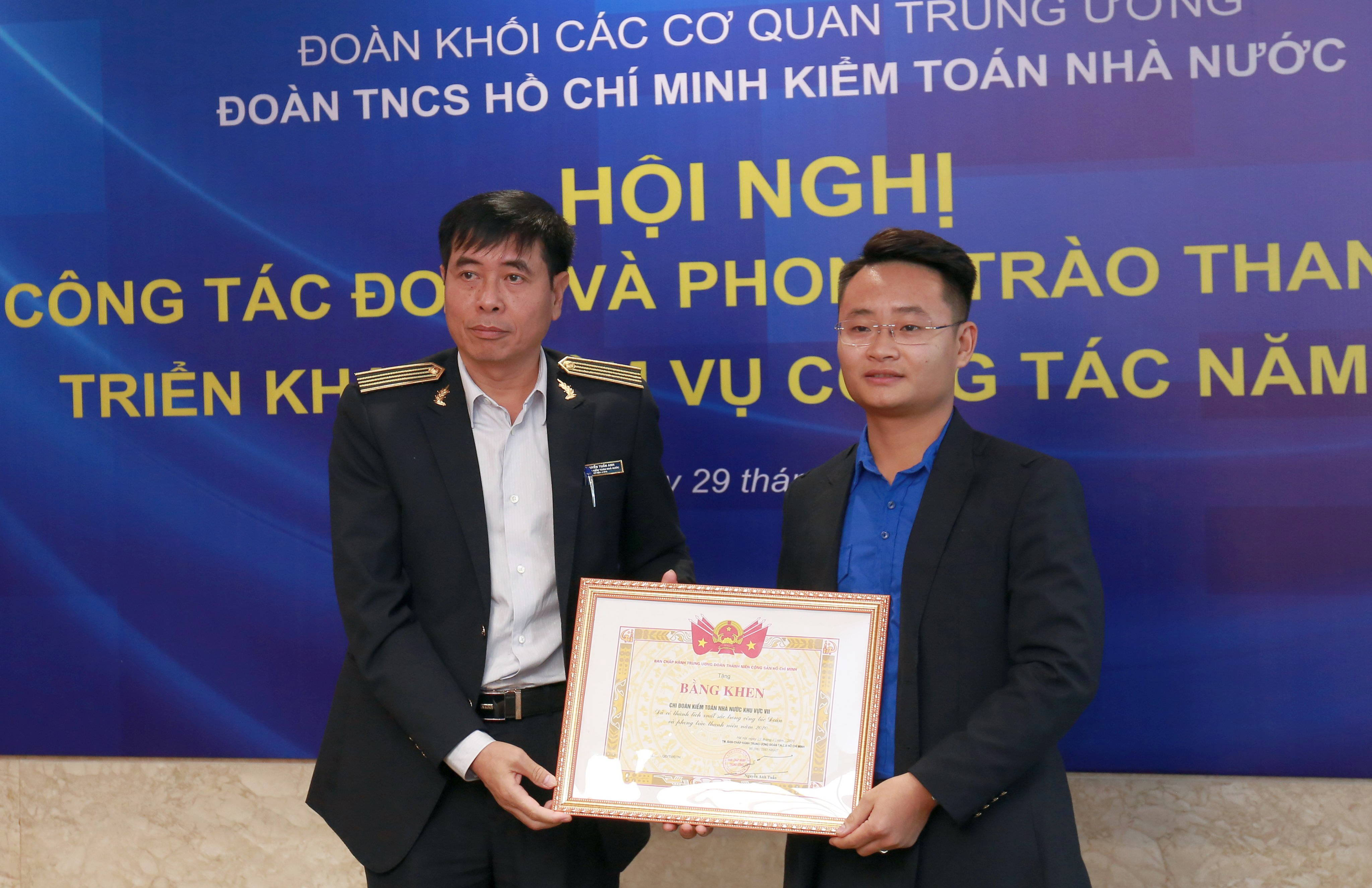 Bí thư Đoàn TN KTNN Ngô Đạt Trí trao Giấy khen của Đoàn TN KTNN cho các cá nhân có thành tích xuất sắc trong công tác đoàn và phong trào thanh niên năm 2020
