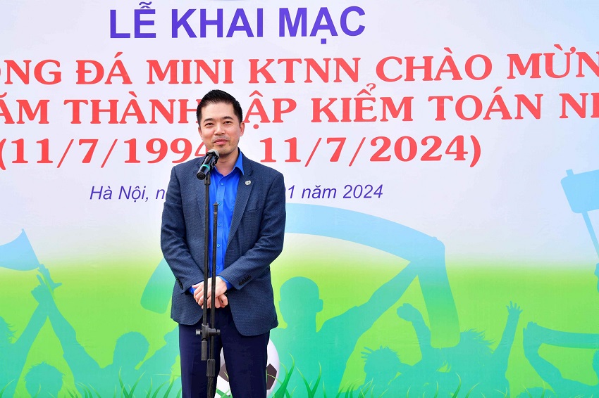 Phát biểu khai mạc Giải, thay mặt Đoàn Thanh niên KTNN - Ban tổ chức giải đấu, Bí thư Đoàn Thanh niên KTNN Lê Mạnh Cường -cảm ơn lãnh đạo Đảng ủy, lãnh đạo KTNN, thủ trưởng các đơn vị trực thuộc KTNN đã quan tâm, tạo điều kiện để Giải diễn ra theo đúng kế hoạch.