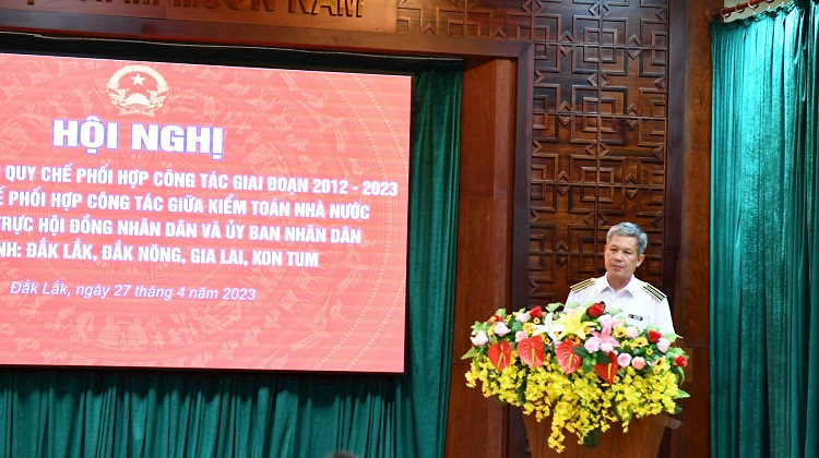 (sav.gov.vn) - Ngày 27/4/2023, tại thành phố Buôn Mê Thuật, tỉnh Đắk Lắk, Kiểm toán nhà nước (KTNN) đã tổ chức Hội nghị sơ kết và ký quy chế phối hợp công tác (QCPHCT) với Thường trực Hội đồng nhân dân (HĐND), Uỷ ban nhân dân (UBND) 4 tỉnh Đắk Lắk, Gia Lai, Kon Tum, Đắk Nông.