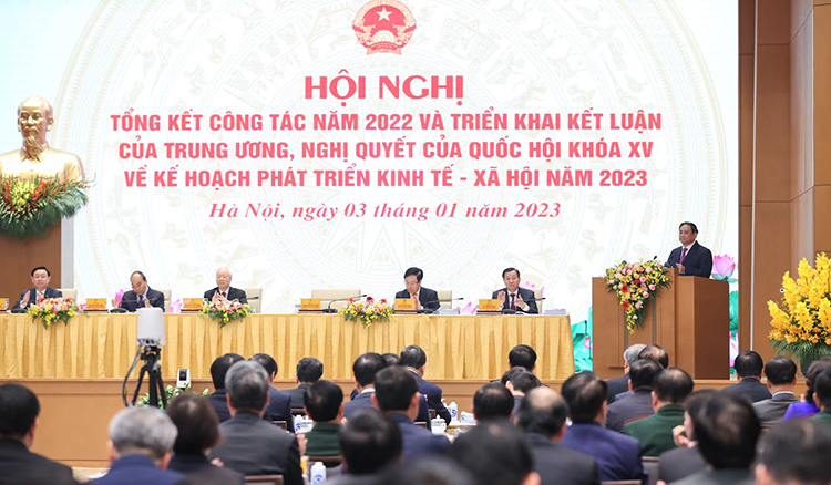 Phát biểu khai mạc, Thủ tướng Chính phủ Phạm Minh Chính nêu rõ, năm 2022, tình hình thế giới biến động nhanh chóng, phức tạp, khó lường, nhiều vấn đề chưa có tiền lệ, khó khăn hơn so với dự báo. Bên cạnh đó, những bất cập, yếu điểm bên trong của nền kinh tế lại bộc lộ rõ hơn như tín dụng ngân hàng, chứng khoán, trái phiếu doanh nghiệp, bất động sản. Mặt khác, các loại dịch bệnh, thiên tai, bão lũ diễn biến phức tạp, gây nhiều thiệt hại. "Có thể nói, năm 2022 nền kinh tế chịu tác động tiêu cực kép cả từ bên ngoài và bên trong đến cùng một thời điểm. Trong bối cảnh đó, chúng ta đã đoàn kết, trên dưới đồng lòng, dọc ngang thông suốt, với quyết tâm cao, nỗ lực lớn, hành động quyết liệt, vượt qua khó khăn, thách thức, hoàn thành các nhiệm vụ được Đảng, Nhà nước và nhân dân giao phó", Thủ tướng Chính phủ nhấn mạnh.
