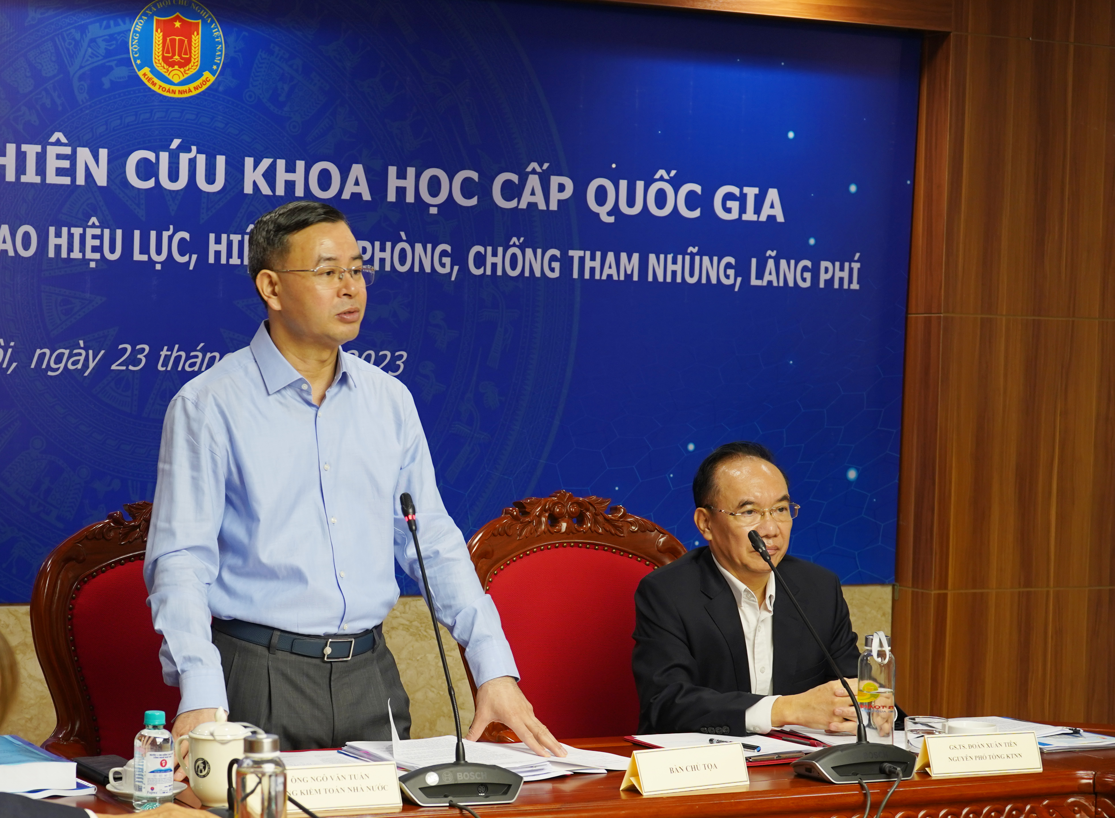 (sav.gov.vn) – Sáng 24/3/2023, tại trụ sở Kiểm toán nhà nước (KTNN) – 116 Nguyễn Chánh, Cầu Giấy, Hà Nội, KTNN tổ chức Hội thảo khoa học đề tài nghiên cứu khoa học (NCKH) cấp quốc gia “Hoàn thiện pháp luật Kiểm toán nhà nước nhằm nâng cao hiệu lực, hiệu quả phòng, chống tham nhũng, lãng phí ở Việt Nam”. Ủy viên Ban chấp hành Trung ương Đảng, Tổng Kiểm toán nhà nước Ngô Văn Tuấn – Chủ nhiệm đề tài; GS.TS. Đoàn Xuân Tiên – nguyên Phó Tổng Kiểm toán nhà nước, thành viên chính đề tài đồng chủ trì hội thảo.