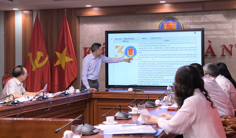 Báo cáo tình hình triển khai cuộc thi sáng tác Logo và Chủ đề Kỷ niệm 30 năm thành lập KTNN, Thường trực Tiểu ban Tuyên truyền cho biết, sau khi KTNN phát động trong toàn Ngành phong trào sáng tác Logo và Chủ đề Kỷ niệm 30 năm thành lập KTNN với thời gian nhận tác phẩm từ ngày 01/4 đến 10/4/2023, Ban tổ chức đã nhận được 44 logo của 20 tổ chức, cá nhân; 30 chủ đề của 14 tổ chức, cá nhân. Đến ngày 14/6/2023, Tiểu ban Tuyên truyền nhận được thêm 04 chủ đề và 03 logo của 01 tập thể và 03 cá nhân thuộc KTNN khu vực I.