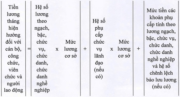 - Công thức tính tiền lương tháng hiện hưởng với cán bộ, công chức, viên chức và người lao động: