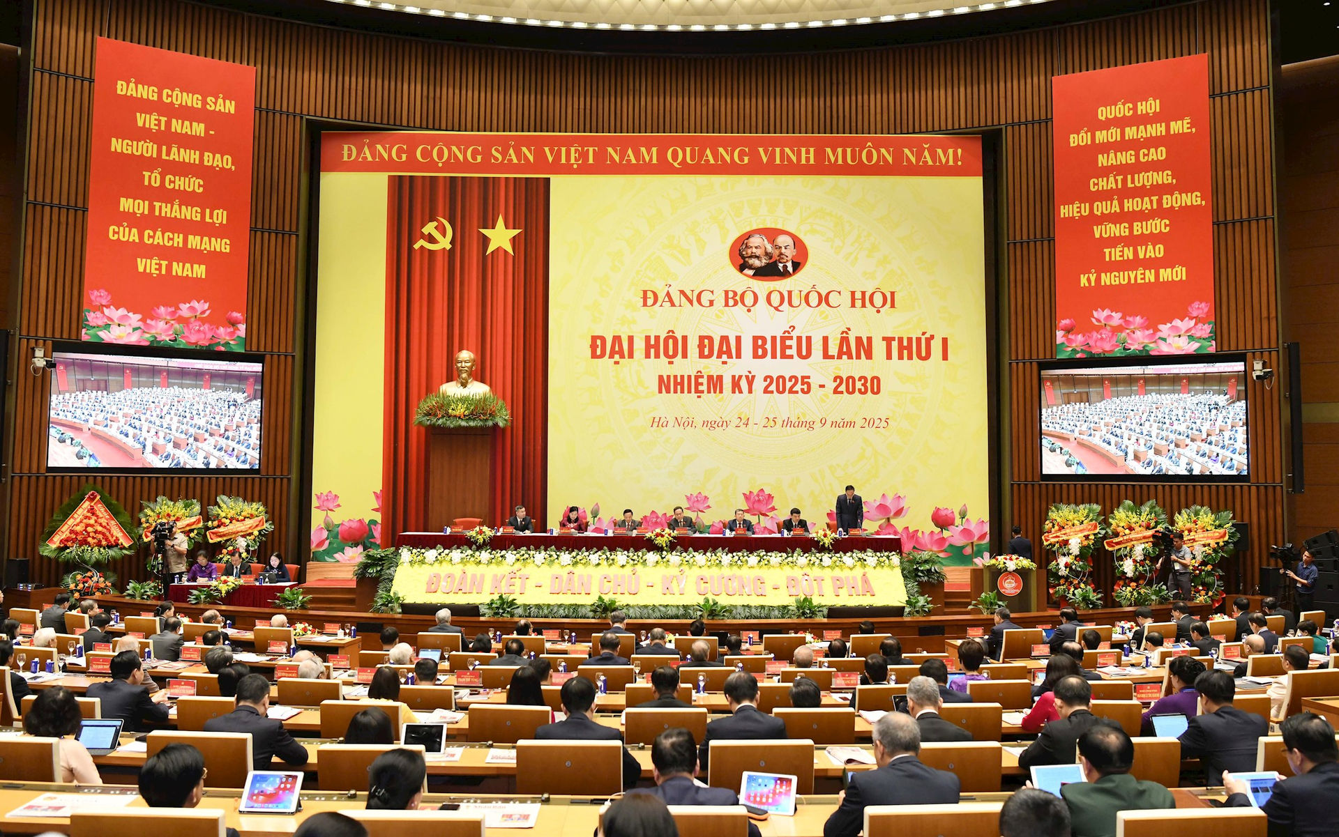 Đại hội đại biểu Đảng bộ Quốc hội lần thứ I, nhiệm kỳ 2025-2030 diễn ra trong 2 ngày 24 và 25/9, tại Hội trường Diên Hồng, Nhà Quốc hội, Thủ đô Hà Nội. Phiên chính thức diễn ra sáng 25/9 có sự tham dự của 297 đại biểu, là các đảng viên tiêu biểu đại diện cho 2.804 đảng viên đang sinh hoạt tại 11 đảng bộ trực thuộc Đảng bộ Quốc hội.