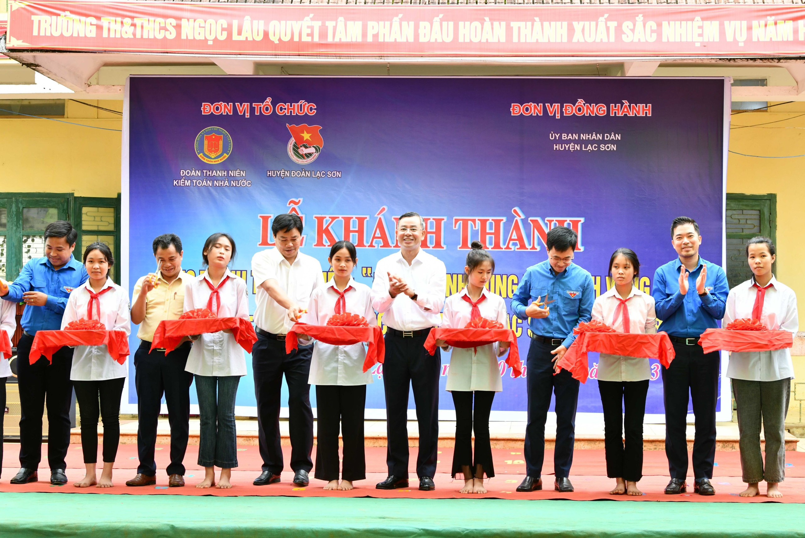Tổng Kiểm toán nhà nước Ngô Văn Tuấn, Bí thư Đoàn Thanh niên KTNN Lê Mạnh Cường cùng các đại diện KTNN cắt băng khánh thành công trình “Đồng hành cùng học sinh vùng cao" tại Trường Tiểu học và Trung học cơ sở Ngọc Lâu, xã Ngọc Lâu, huyện Lạc Sơn, tỉnh Hòa Bình, ngày 10/5/2023.