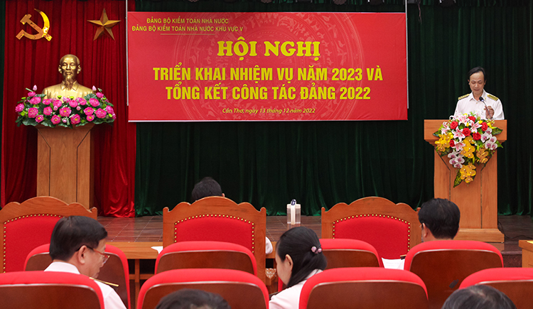 (sav.gov.vn) - Ngày 13/12/2021, tại thành phố Cần Thơ, Kiểm toán nhà nước (KTNN) khu vực V đã tổ chức Hội nghị triển khai nhiệm vụ năm 2023 và Tổng kết công tác đảng năm 2022. Ủy viên thường vụ Ban Cán sự Đảng, Phó Tổng Kiểm toán nhà nước Doãn Anh Thơ dự và chỉ đạo Hội nghị. Cùng dự có Phó Vụ trưởng Vụ Tổng hợp Lê Hoài Nam, toàn thể Lãnh đạo, công chức, người lao động của KTNN khu vực V.