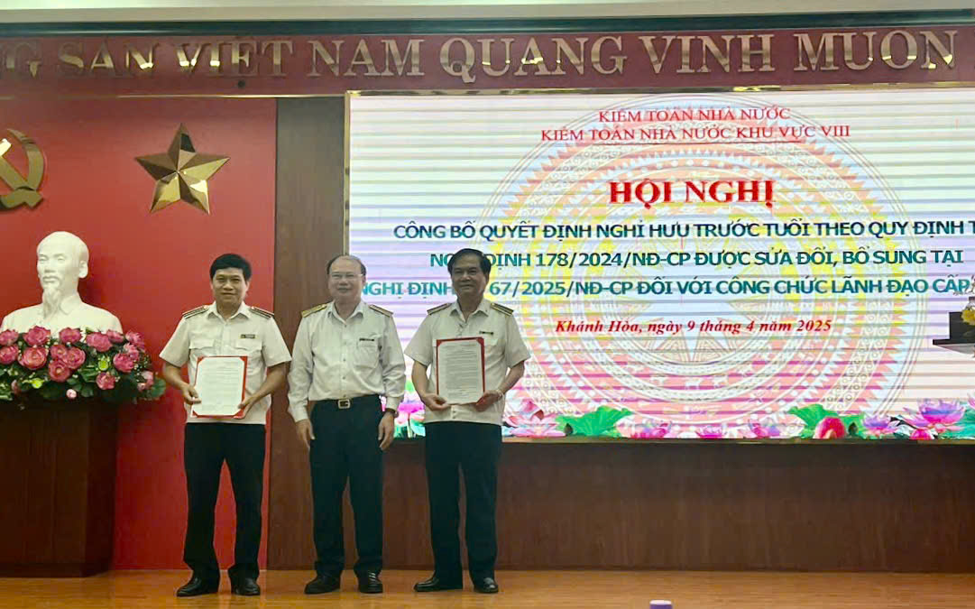 (sav.gov.vn) - Chiều 09/4, tại thành phố Nha Trang, tỉnh Khánh Hòa, Kiểm toán nhà nước (KTNN) khu vực VIII đã tổ chức Hội nghị trao quyết định nghỉ hưu trước tuổi theo Nghị định số 178/2024/NĐ-CP của Chính phủ cho ông Đặng Đức Hiệt - Trưởng phòng Kiểm toán đầu tư dự án và ông Dương Văn Chất - Phó Trưởng phòng Kiểm toán ngân sách 1.