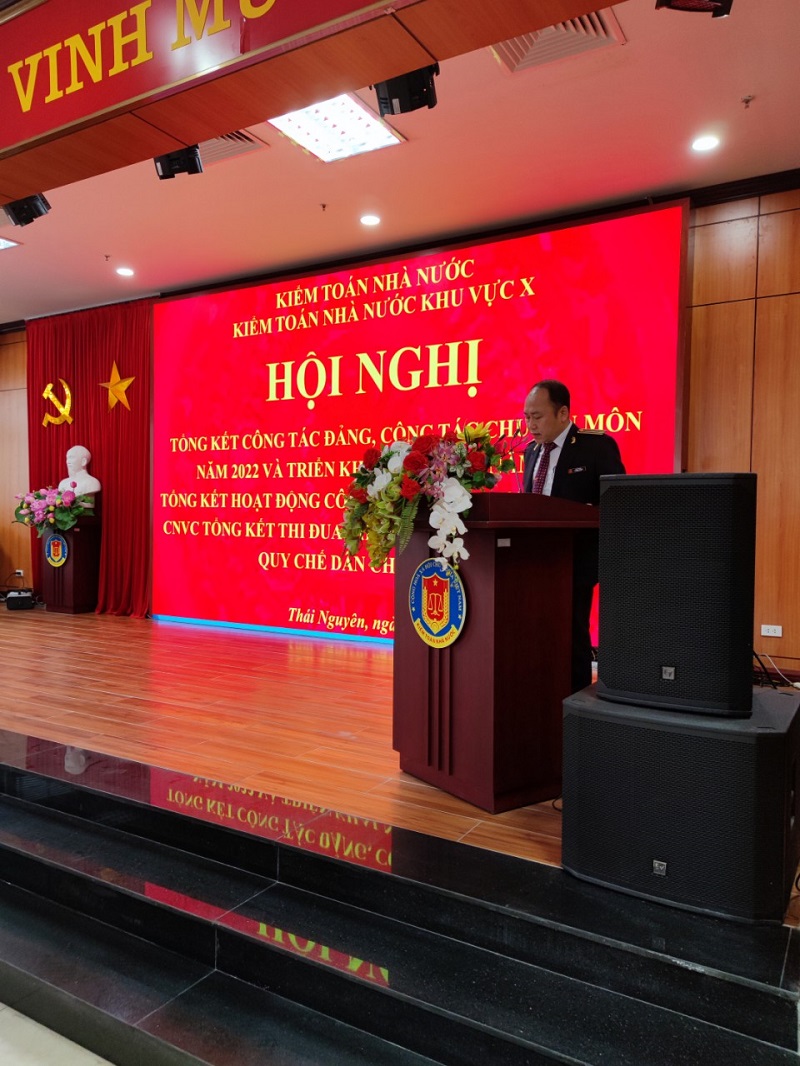 Trình bày Báo cáo tổng kết công tác năm 2022 và triển khai nhiệm vụ công tác năm 2023, Phó Kiểm toán trưởng KTNN khu vực X Võ Sỹ Nam cho biết: Năm 2022, mặc dù dịch Covid 19 tiếp tục diễn biến phức tạp, ảnh hưởng đến hoạt động kiểm toán, song với sự quan tâm chỉ đạo sát sao của Ban cán sự, Đảng ủy và Lãnh đạo KTNN, KTNN khu vực X đã đoàn kết, nỗ lực, khắc phục khó khăn, hoàn thành tốt nhiệm vụ kiểm toán, đảm bảo tiến độ và chất lượng. Ngay từ đầu năm, KTNN khu vực X đã tổ chức các lớp tập huấn, bồi dưỡng chuyên môn nghiệp vụ và phổ biến các mục tiêu, nội dung, trọng tâm kiểm toán năm 2022; quán triệt kỷ luật, kỷ cương, văn hóa nghề nghiệp cho công chức, Kiểm toán viên; phương thức kiểm toán được bố trí linh hoạt từ công tác lập kế hoạch kiểm toán (KHKT), thực hiện kiểm toán đến lập báo cáo kiểm toán (BCKT).