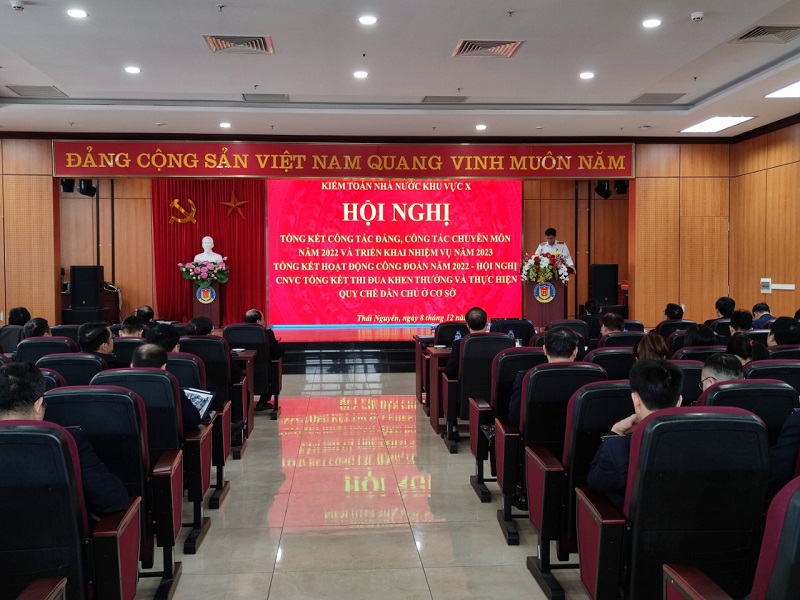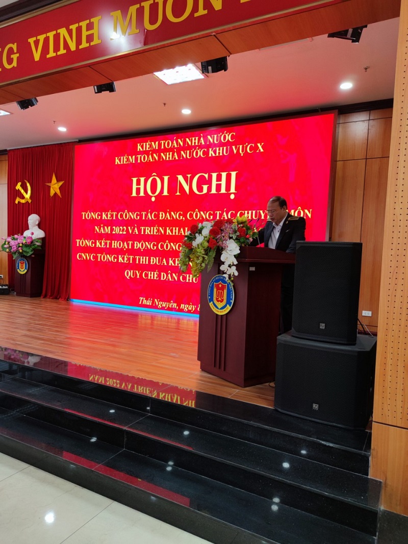 (sav.gov.vn) - Sáng 08/12/2022, tại thành phố Thái Nguyên, Kiểm toán nhà nước (KTNN) khu vực X tổ chức Hội nghị tổng kết công tác năm 2022 và triển khai nhiệm vụ công tác năm 2023. Phó Bí thư Đảng ủy, Phó Tổng Kiểm toán nhà nước Nguyễn Tuấn Anh dự và phát biểu chỉ đạo tại hội nghị.