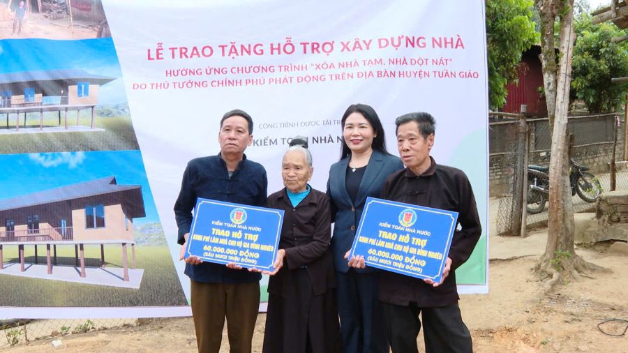 (sav.gov.vn) - Ngày 16/3/2025, tại tỉnh Điện Biên, Phó Tổng Kiểm toán nhà nước Hà Thị Mỹ Dung cùng Đoàn công tác, lãnh đạo huyện Tuần Giáo, tỉnh Điện đã đến thăm và trao kinh phí 120 triệu đồng để xây dựng 2 căn nhà cho gia đình ông Lò Văn Túi tại bản Chiềng Chung, ông Lò Văn Giót, bản Chiềng Khoang, thị trấn Tuần Giáo, huyện Tuần Giáo, tỉnh Điện Biên.