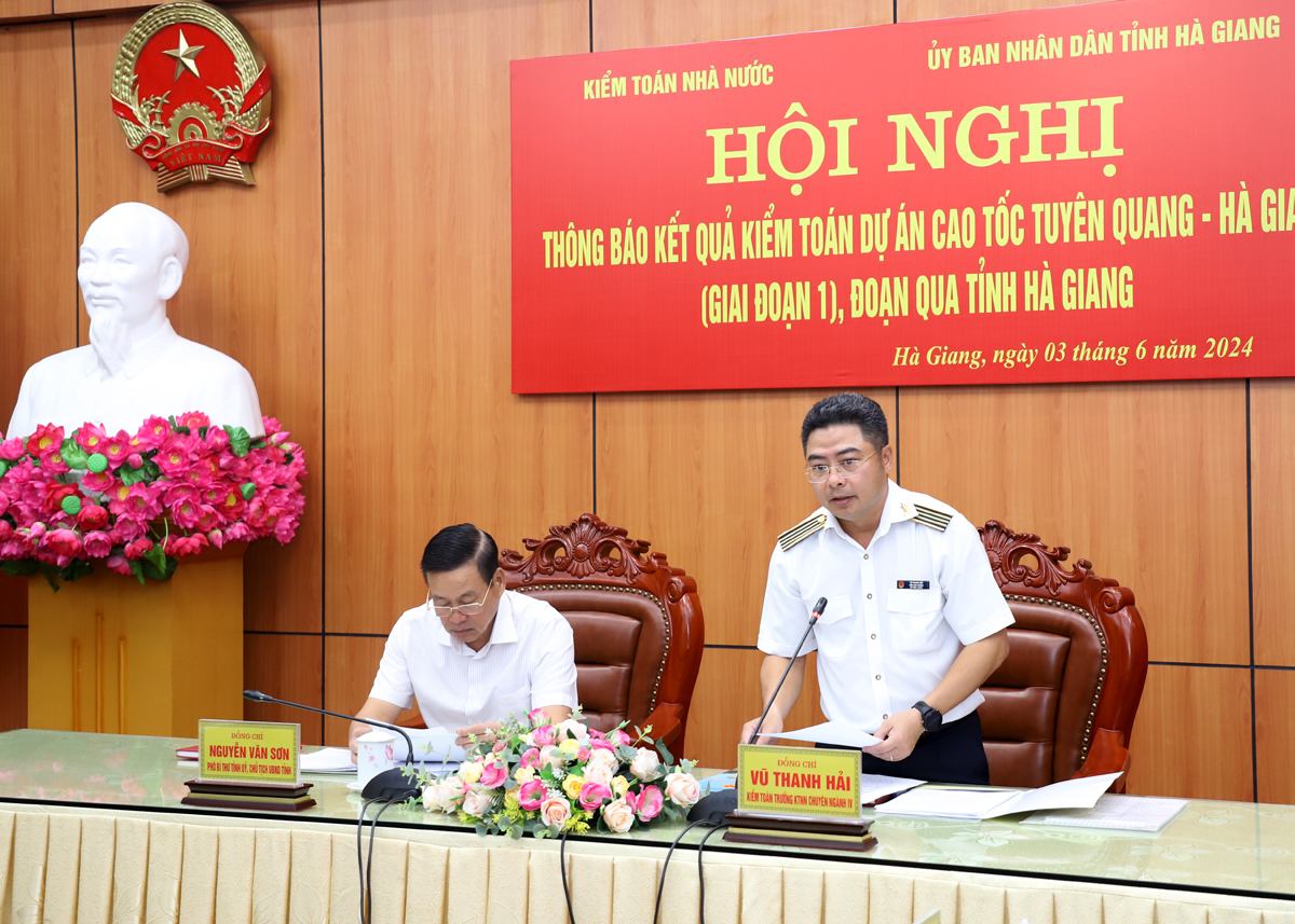(sav.gov.vn) - Sáng 3/6, Kiểm toán nhà nước (KTNN) chuyên ngành IV phối hợp với UBND tỉnh tổ chức Hội nghị công bố kết quả kiểm toán Dự án Cao tốc Tuyên Quang – Hà Giang (giai đoạn 1), đoạn qua tỉnh Hà Giang. Các đồng chí: Nguyễn Văn Sơn, Phó Bí thư Tỉnh ủy, Chủ tịch UBND tỉnh; Vũ Thanh Hải, Kiểm toán trưởng KTNN chuyên ngành IV đồng chủ trì. Dự có đồng chí Hà Thị Minh Hạnh, Tỉnh ủy viên, Phó Chủ tịch UBND tỉnh; các thành viên đoàn kiểm toán; lãnh đạo một số sở, ngành và huyện Bắc Quang.