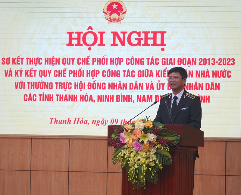 Kiểm toán trưởng KTNN khu vực XI Đoàn Chiến Thắng trình bày báo cáo sơ kết thực hiện Quy chế phối hợp công tác giai đoạn 2013 - 2023 giữa KTNN và Thường trực HĐND, UBND các tỉnh Thanh Hóa, Ninh Bình, Nam Định, Thái Bình