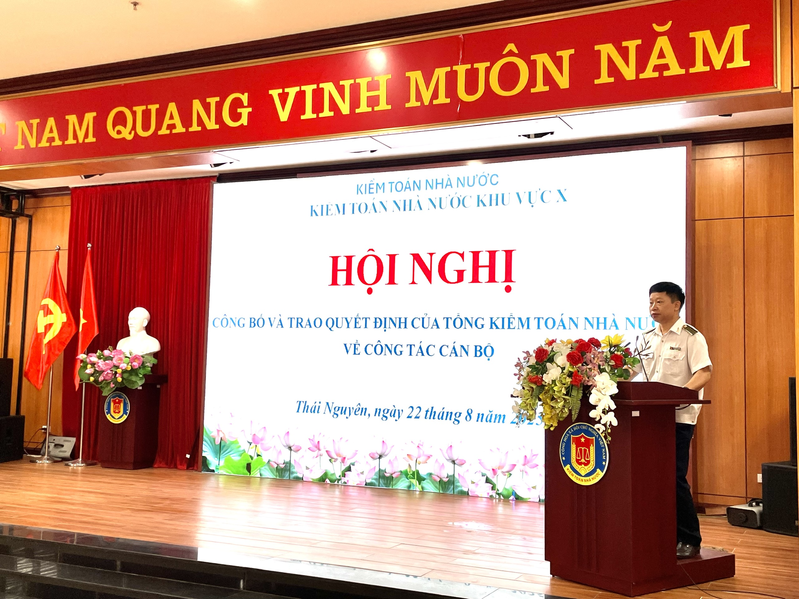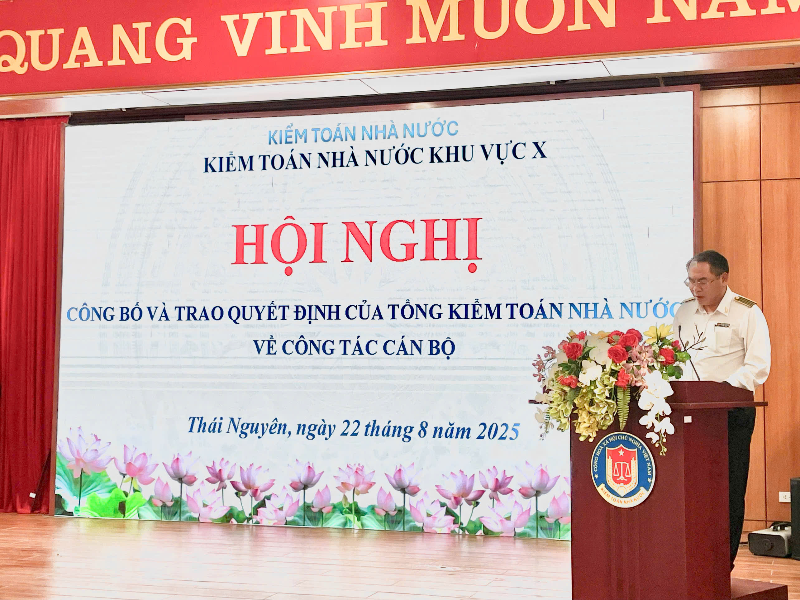 (sav.gov.vn) - Sáng 22/8, tại trụ sở Kiểm toán nhà nước (KTNN) khu vực X - tỉnh Thái Nguyên, KTNN khu vực X phối hợp với Vụ Tổ chức cán bộ tổ chức Hội nghị công bố quyết định nghỉ hưu trước tuổi theo quy định tại Nghị định số 178/2024/NĐ-CP được sửa đổi, bổ sung tại Nghị định số 67/2025/NĐ-CP cho đồng chí Nguyễn Minh Giang - Phó Kiểm toán trưởng KTNN khu vực X.