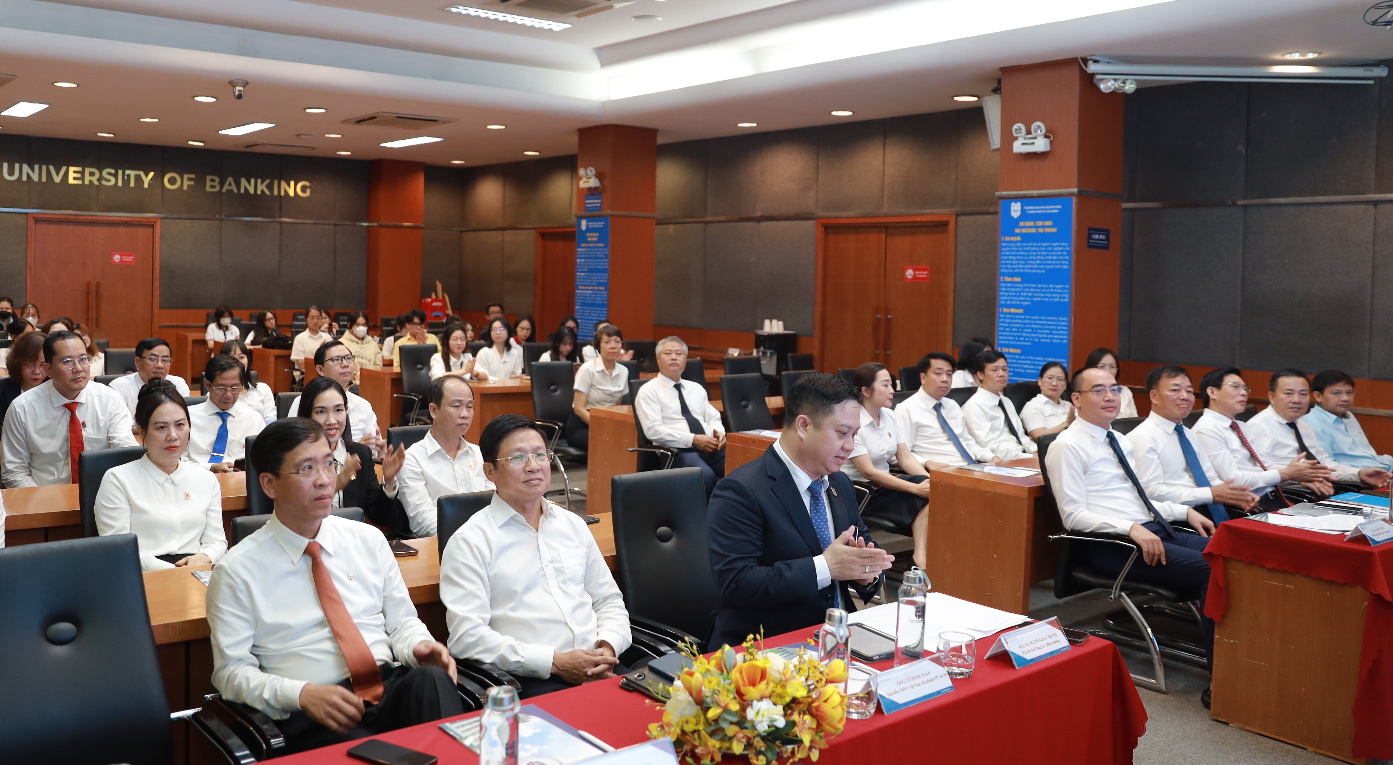 Đại biểu tại Thành phố Hồ Chí Minh có PGS.TS Nguyễn Đức Trung - Hiệu trưởng Trường Đại học Ngân hàng Thành phố Hồ Chí Minh; ông Võ Minh Tuấn - Giám đốc Ngân hàng nhà nước chi nhánh Thành phố Hồ Chí Minh và các lãnh đạo phòng, khoa của Trường Đại học Ngân hàng Thành phố Hồ Chí Minh.