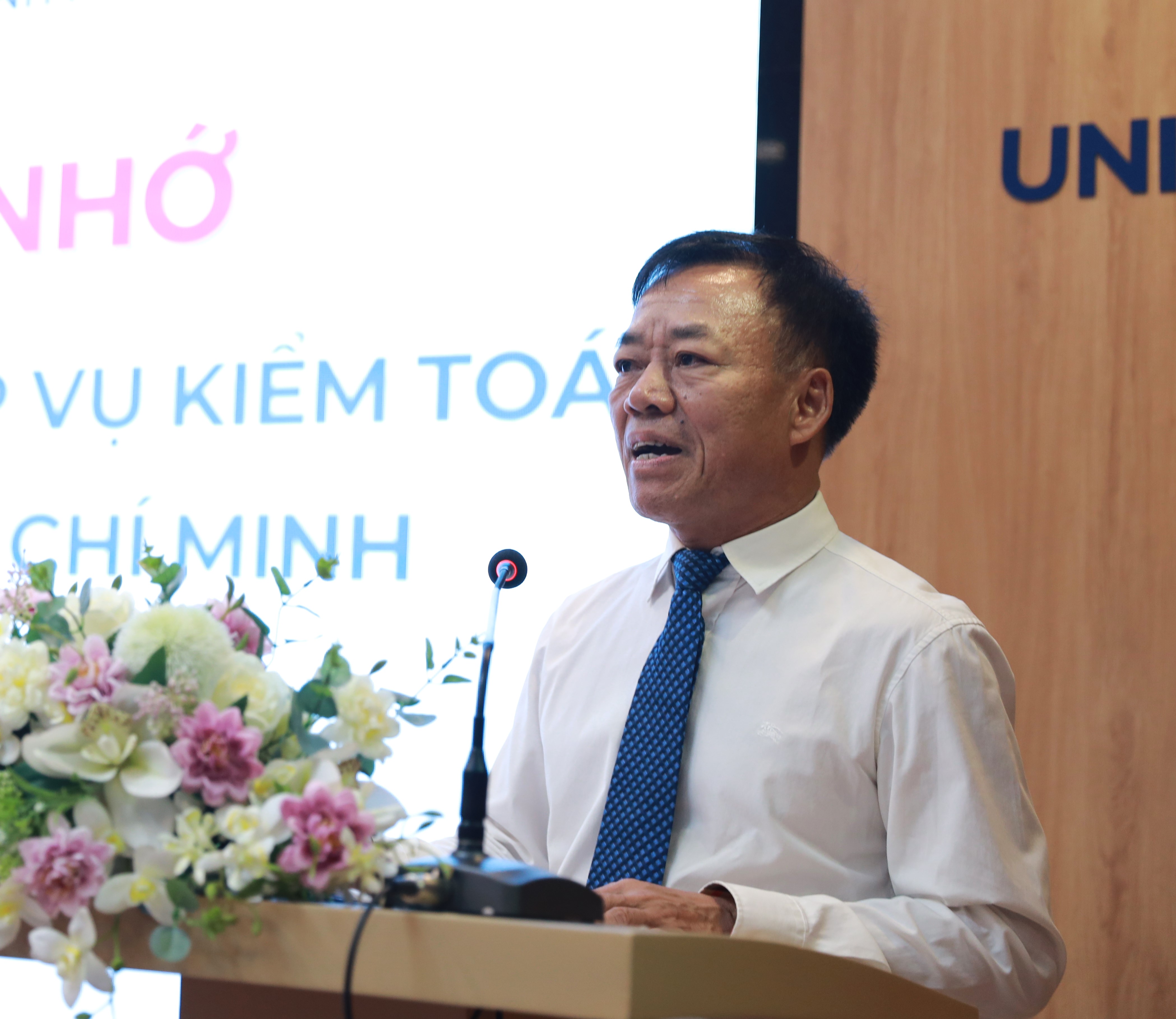 Giám đốc Trường Đào tạo và Bồi dưỡng nghiệp vụ kiểm toán Trần Kim Lộc phát biểu. Ảnh: HUB