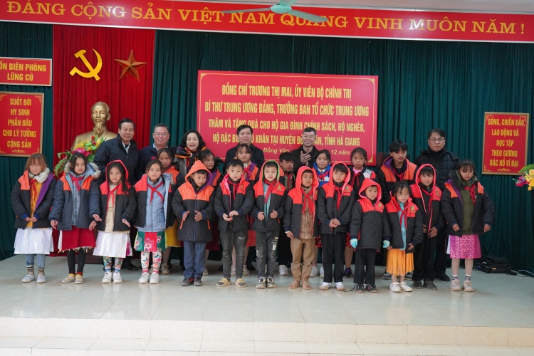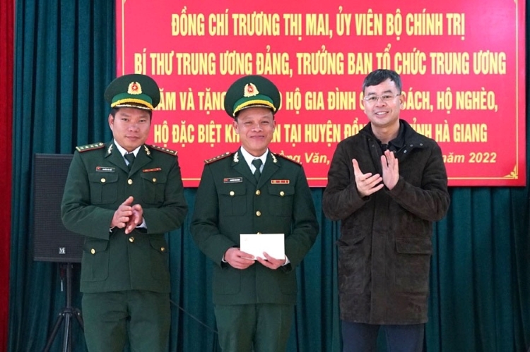 Đoàn công tác đã tới thăm, tặng quà cán bộ, chiến sỹ Đồn Biên phòng Lũng Cú và trao quà cho một số gia đình chính sách, hộ nghèo, học sinh hiếu học trên địa bàn xã Lũng Cú, huyện Đồng Văn. Trưởng Ban Tổ chức Trung ương Trương Thị Mai chia sẻ khó khăn và đánh giá cao những đóng góp của cán bộ, chiến sỹ trong việc đảm bảo an ninh trật tự trên tuyến biên giới, giữ vững chủ quyền, toàn vẹn lãnh thổ quốc gia. Tại đây, Trưởng ban Tổ chức Trung ương Trương Thị Mai cùng Đoàn công tác đã trao quà cho các cán bộ, chiến sỹ Đồn Biên phòng Lũng Cú; trao 300 suất quà cho gia đình chính sách, hộ nghèo, hộ đặc biệt khó khăn trên địa bàn huyện Đồng Văn.