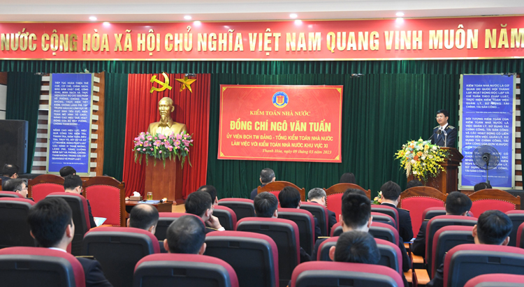 (sav.gov.vn) - Ngày 9/3/2023, tại trụ sở Kiểm toán nhà nước (KTNN) khu vực XI, thành phố Thanh Hoá, tỉnh Thanh Hóa, Ủy viên Ban Chấp hành Trung ương Đảng, Tổng Kiểm toán nhà nước Ngô Văn Tuấn đã đến thăm và làm việc với Lãnh đạo, công chức và người lao động KTNN khu vực XI.