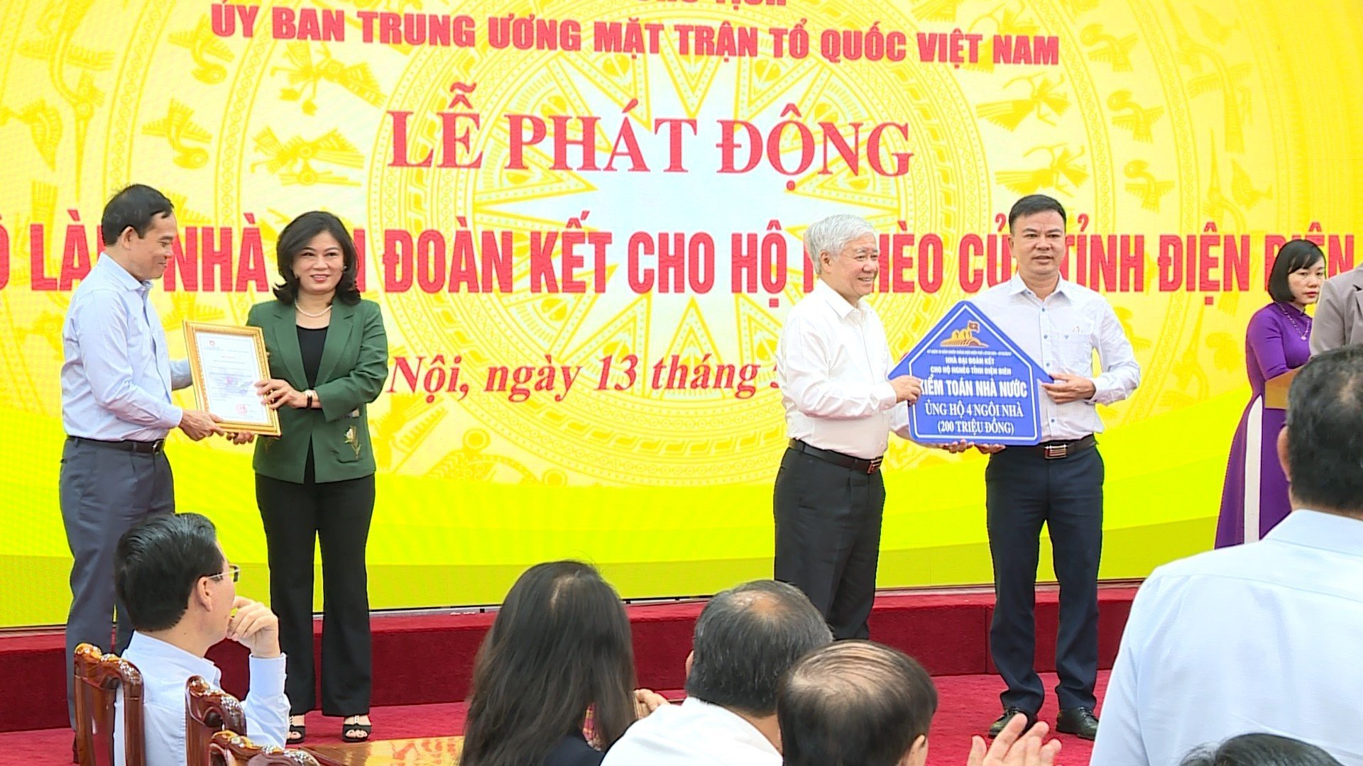 Chủ tịch nước Võ Văn Thưởng, Chủ tịch Uỷ ban Trung ương Mặt trận Tổ quốc Việt Nam Đỗ Văn Chiến, Phó Thủ tướng Chính phủ Trần Lưu Quang và Lãnh đạo các tổ chức chính trị - xã hội đã thay mặt Lãnh đạo Đảng, Nhà nước trao số tiền tiếp nhận ủng hộ đợt I gồm 200 tỉ đồng, tương đương 4.000 căn nhà đại đoàn kết cho tỉnh Điện Biên./.