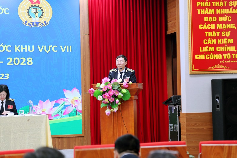 Phát biểu chỉ đạo Đại hội, Phó Chủ tịch chuyên trách Công đoàn KTNN Vũ Lập Công đánh giá cao những kết quả đã đạt được của Công đoàn KTNN khu vực VII trong nhiệm kỳ vừa qua. Nhất trí với dự thảo Báo cáo, Phó Chủ tịch Công đoàn KTNN lưu ý năm 2023 là năm toàn Ngành triển khai các hoạt động để hướng tới kỷ niệm 30 năm thành lập KTNN, do đó Công đoàn KTNN khu vực VII cần phối hợp với Lãnh đạo đơn vị xây dựng các chương trình, kế hoạch hành động, tạo không khí thi đua sôi nổi.