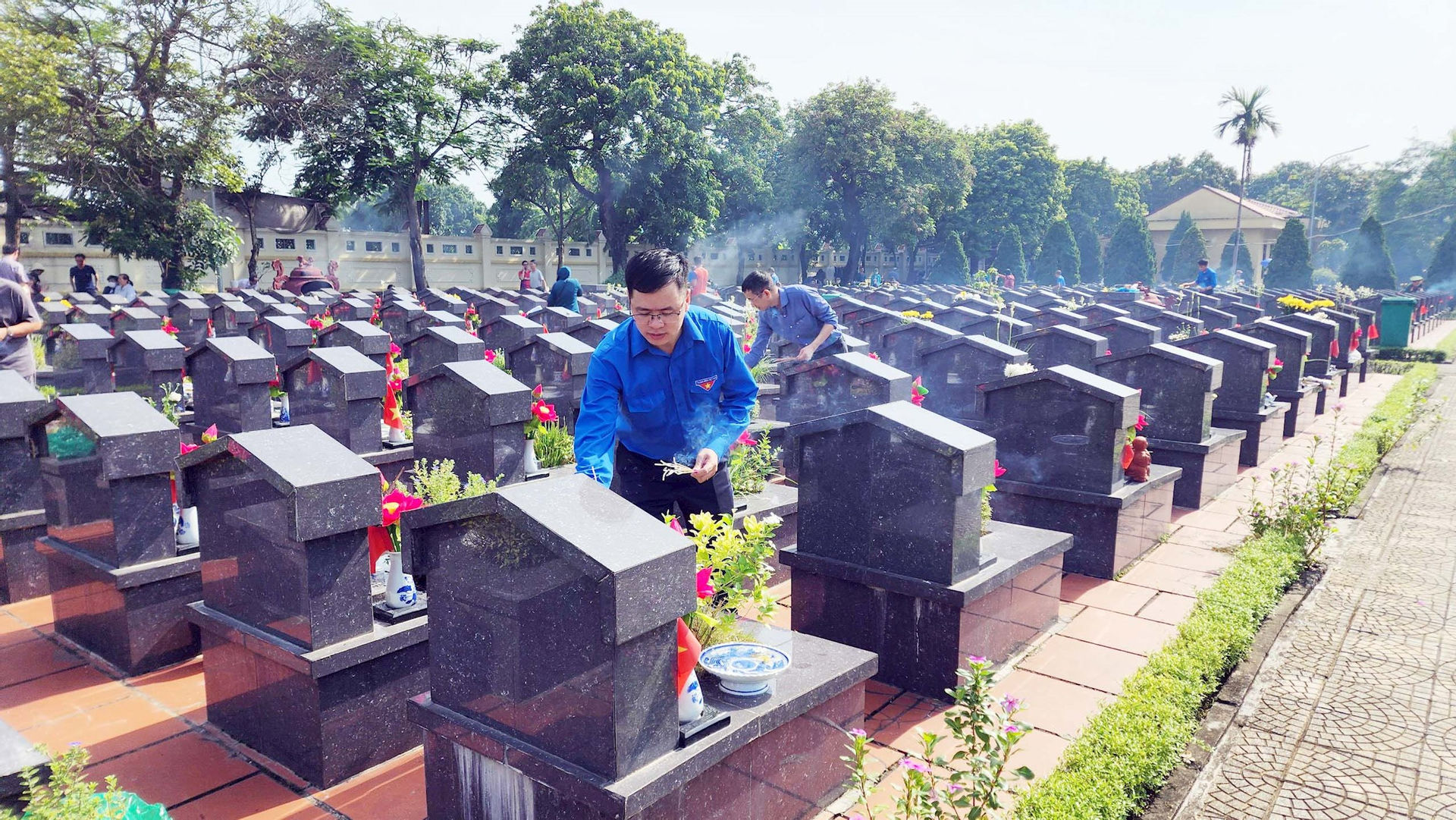 Sau Lễ dâng hương, dâng hoa, tập thể lãnh đạo, công chức và đoàn viên, thanh niên đã đến thắp hương tại từng phần mộ của các Anh hùng liệt sỹ để bày tỏ lòng biết ơn sâu sắc đối với những người con ưu tú đã không tiếc máu xương, chiến đấu anh dũng, hy sinh vì nền độc lập, tự do của Tổ quốc, vì cuộc sống bình yên của Nhân dân.