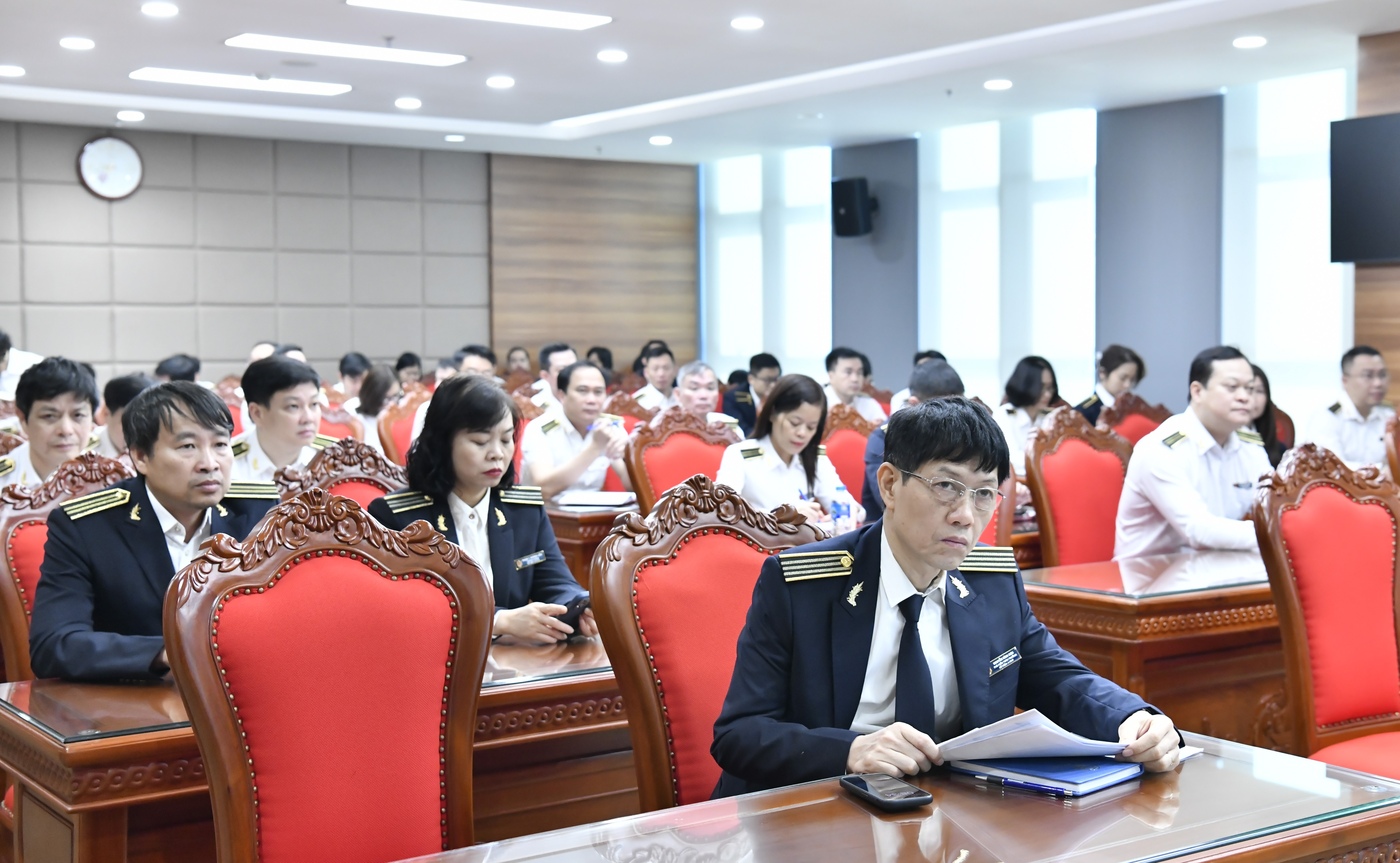 Các đảng viên, kiểm toán viên nghiêm túc lắng nghe nội dung được phổ biến tại buổi sinh hoạt chính trị nội bộ.