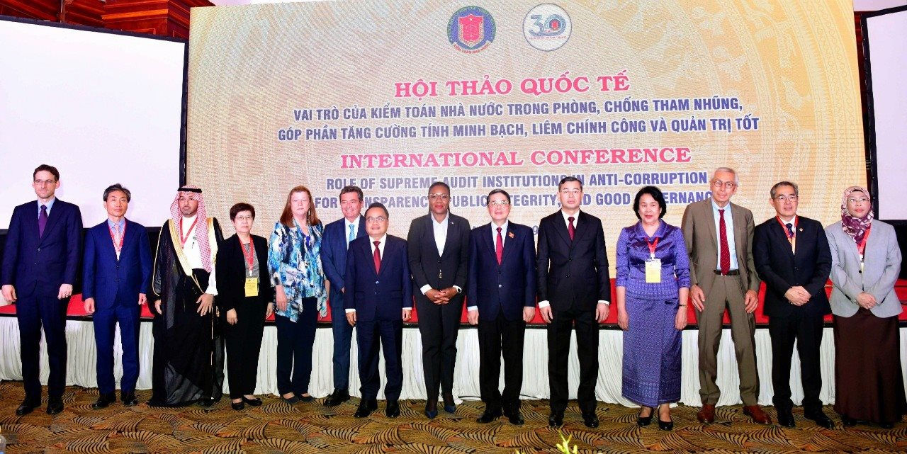 Ủy viên Ban Chấp hành Trung ương Đảng, Phó Chủ tịch Quốc hội Nguyễn Đức Hải chụp ảnh lưu niệm cùng các đại biểu tham dự Hội thảo quốc tế về “Vai trò của các cơ quan kiểm toán tối cao trong phòng, chống tham nhũng, tăng cường tính minh bạch, liêm chính công và quản trị tốt” ngày 09/7