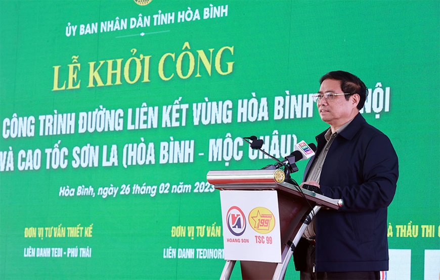 (sav.gov.vn) - Sáng 26/2/2023, Ủy viên Bộ Chính trị, Thủ tướng Chính phủ Phạm Minh Chính đã dự và phát lệnh khởi công đường liên kết vùng Hòa Bình - Hà Nội và cao tốc Sơn La, đoạn Hòa Bình - Mộc Châu). Cùng dự có Bộ trưởng Bộ Tài chính Hồ Đức Phớc; Tổng Kiểm toán nhà nước Ngô Văn Tuấn; Bí thư Tỉnh ủy Hòa Bình Nguyễn Phi Long; Lãnh đạo các Bộ, ngành Trung ương và tỉnh Hòa Bình.