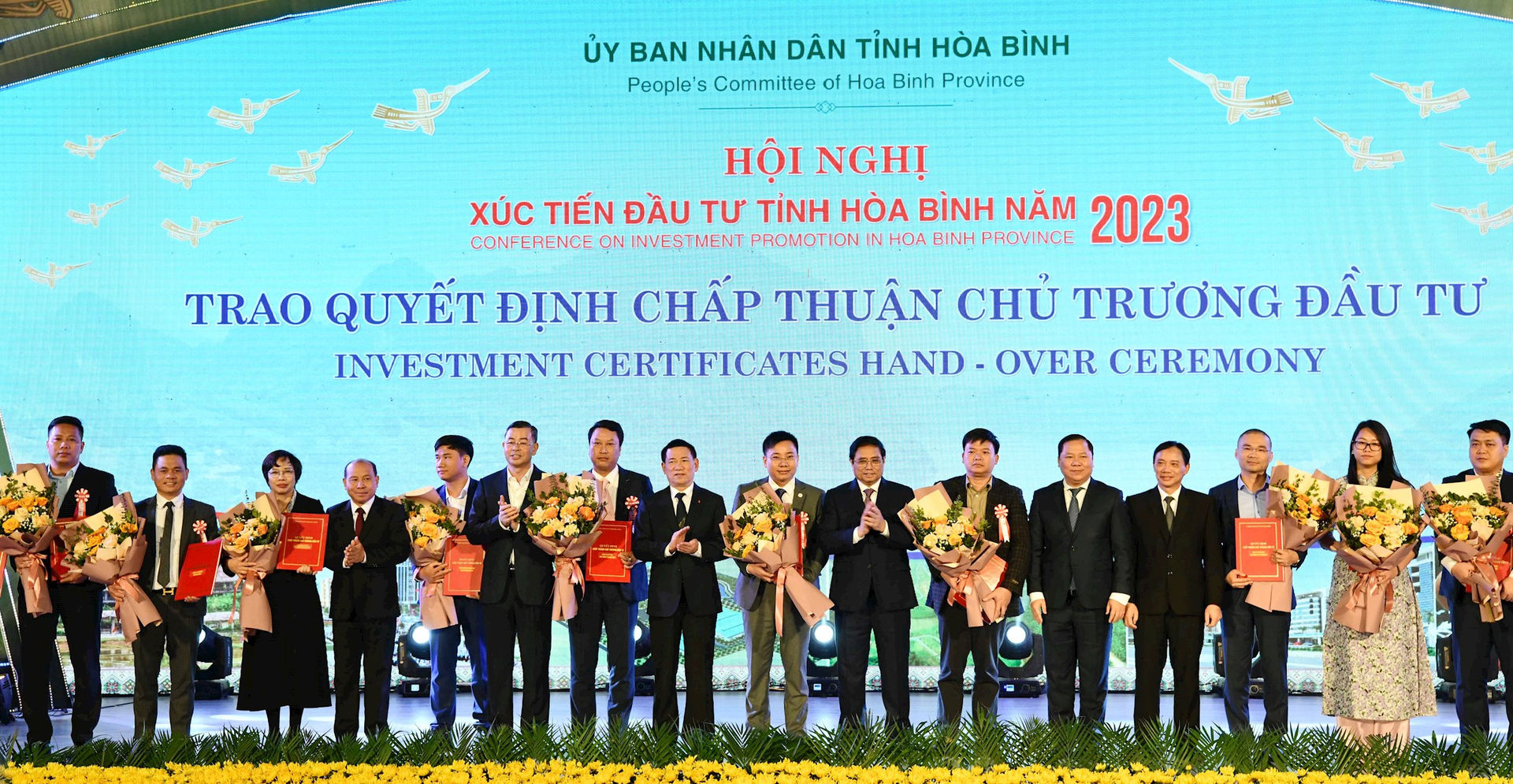 Thủ tướng Phạm Minh Chính và lãnh đạo Bộ, ngành, địa phương chúc mừng các doanh nghiệp được chấp thuận chủ trương đầu tư tại tỉnh Hòa Bình.