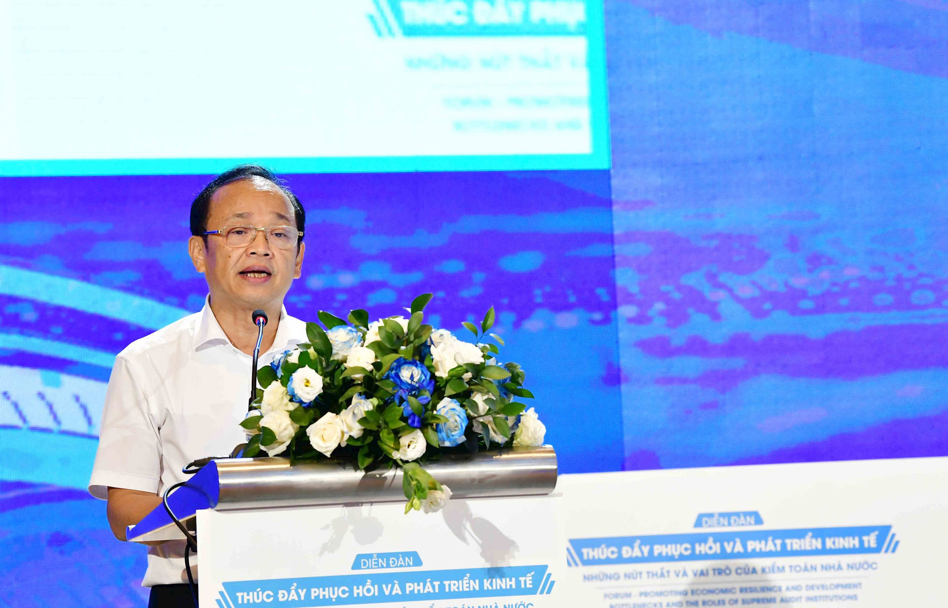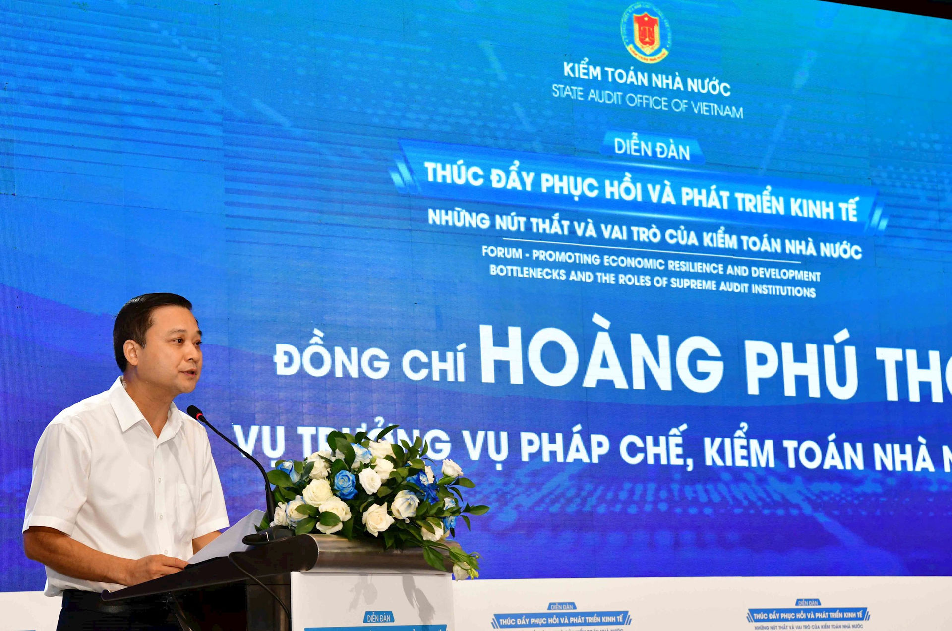 “Để góp thêm những nhìn nhận và giải pháp góp phần tháo gỡ những nút thắt, khó khăn, vướng mắc nhằm thúc đẩy phục hồi và phát triển kinh tế, đồng thời làm rõ vai trò và trách nhiệm của KTNN trong xây dựng chính sách pháp luật, giám sát và hỗ trợ việc thực thi pháp luật, hôm nay, KTNN tổ chức Diễn đàn “Thúc đẩy phục hồi và phát triển kinh tế - những nút thắt và vai trò của Kiểm toán nhà nước”” - ông Hoàng Phú Thọ nhấn mạnh.