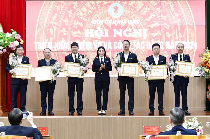 Phó Tổng Kiểm toán nhà nước Hà Thị Mỹ Dung trao Bằng khen của Tổng Kiểm toán nhà nước cho các cuộc kiểm toán được xếp loại xuất sắc và cuộc kiểm toán có thành tích đột xuất xuất sắc trong thực hiện nhiệm vụ kiểm toám năm 2023