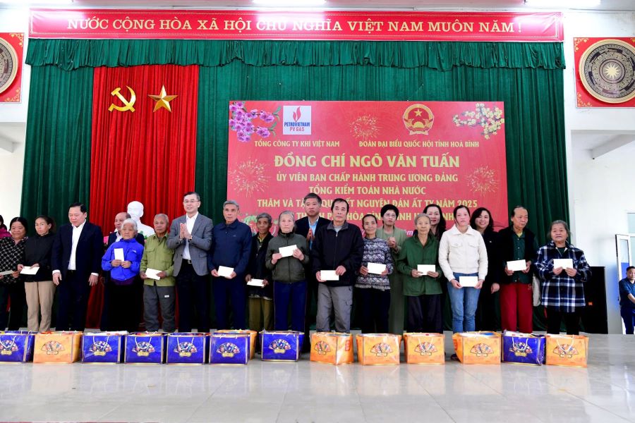 (sav.gov.vn) - Nhân dịp Tết Nguyên đán Ất Tỵ 2025, chiều 17/01, Ủy viên Trung ương Đảng, Tổng Kiểm toán nhà nước Ngô Văn Tuấn cùng Đoàn công tác của Kiểm toán nhà nước (KTNN) đã thăm, tặng 200 suất quà cho người nghèo, công nhân lao động tại thành phố Hòa Bình, tỉnh Hòa Bình