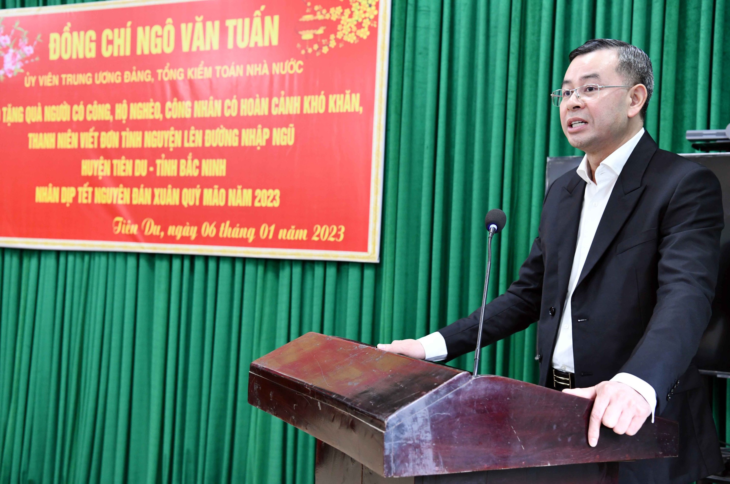 Phát biểu tại buổi trao quà Tết, Tổng Kiểm toán nhà nước Ngô Văn Tuấn cho biết: Thực hiện chỉ thị số 19-CT/TW ngày 18/11/2022 của Ban Bí thư về việc tổ chức Tết Quý Mão năm 2023, Kiểm toán nhà nước phối hợp với Tổng Liên đoàn Lao động Việt Nam tổ chức thăm và tặng quà cho người có công, hộ nghèo, công nhân lao động có hoàn cảnh khó khăn trên địa bàn huyện Tiên Du, tỉnh Bắc Ninh. Đây là hoạt động có ý nghĩa, khẳng định sự quan tâm, chăm lo của Đảng, Nhà nước đối với đời sống của Nhân dân, nhất là người nghèo, người có hoàn cảnh khó khăn, những cá nhân, gia đình bị ảnh hưởng bởi thiên tai, bão lũ, dịch bệnh COVID-19. "Chúng tôi hy vọng những món quà nhỏ cùng với tình cảm sẻ chia của mỗi cán bộ, công chức, viên chức và người lao động Kiểm toán nhà nước cũng như Tổng Liên đoàn Lao động Việt Nam sẽ mang đến và tiếp thêm ngọn lửa ấm áp, để mỗi người dân, công nhân lao động tại khu công nghiệp, khu chế xuất vượt qua khó khăn, đón Tết cổ truyền đầm ấm bên gia đình" - Tổng Kiểm toán nhà nước chia sẻ.
