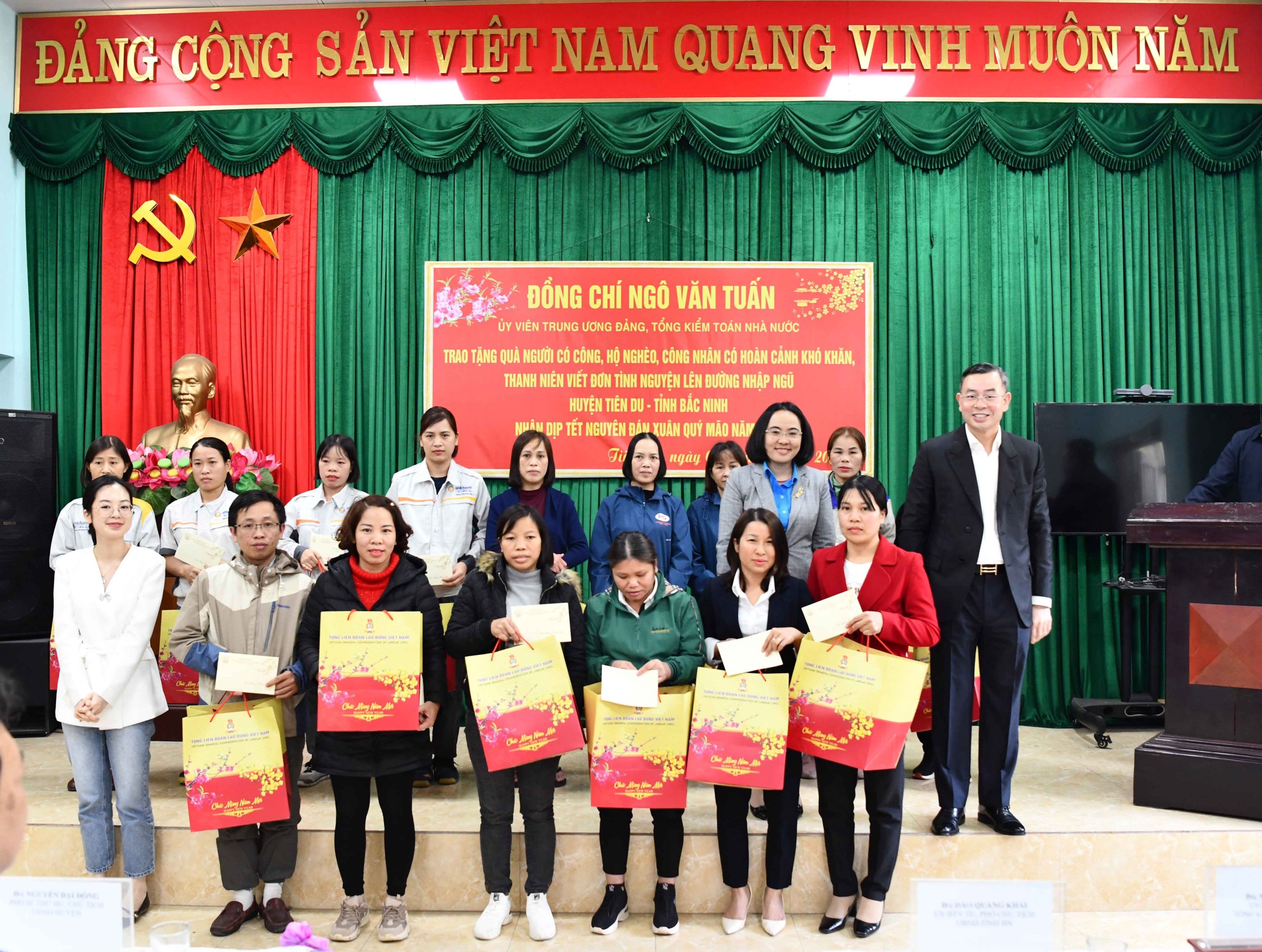 (sav.gov.vn) - Trước thềm năm mới - xuân Quý Mão, chiều 6/1/2023, Uỷ viên Ban chấp hành Trung ương Đảng, Tổng Kiểm toán nhà nước Ngô Văn Tuấn và Đoàn công tác của Tổng Liên đoàn Lao động Việt Nam, Kiểm toán nhà nước đã tổ chức thăm hỏi, động viên, trao quà Tết cho người có công, hộ nghèo, công nhân lao động có hoàn cảnh khó khăn, thanh niên viết đơn tình nguyện lên đường nhập ngũ tại xã Liên Bão, huyện Tiên Du, tỉnh Bắc Ninh.