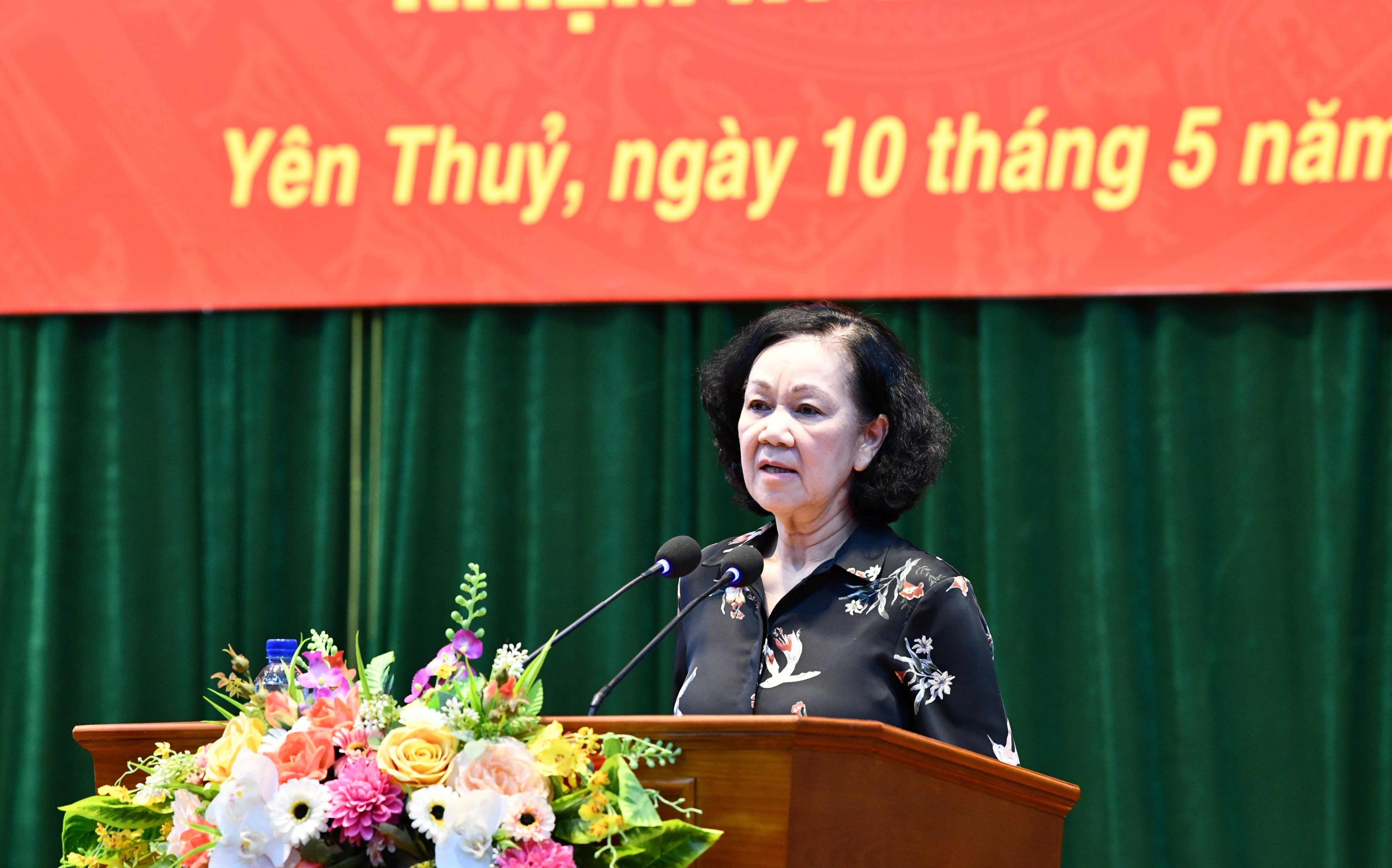 Phát biểu kết luận hội nghị tiếp xúc cử tri huyện Yên Thuỷ, Ủy viên Bộ Chính trị, Thường trực Ban Bí thư, Trưởng Ban Tổ chức Trung ương Trương Thị Mai cảm ơn và ghi nhận, tiếp thu những ý kiến, kiến nghị của cử tri; đồng thời giải đáp cụ thể về một số kiến nghị thuộc thẩm quyền giải quyết của Chính phủ, Quốc hội.