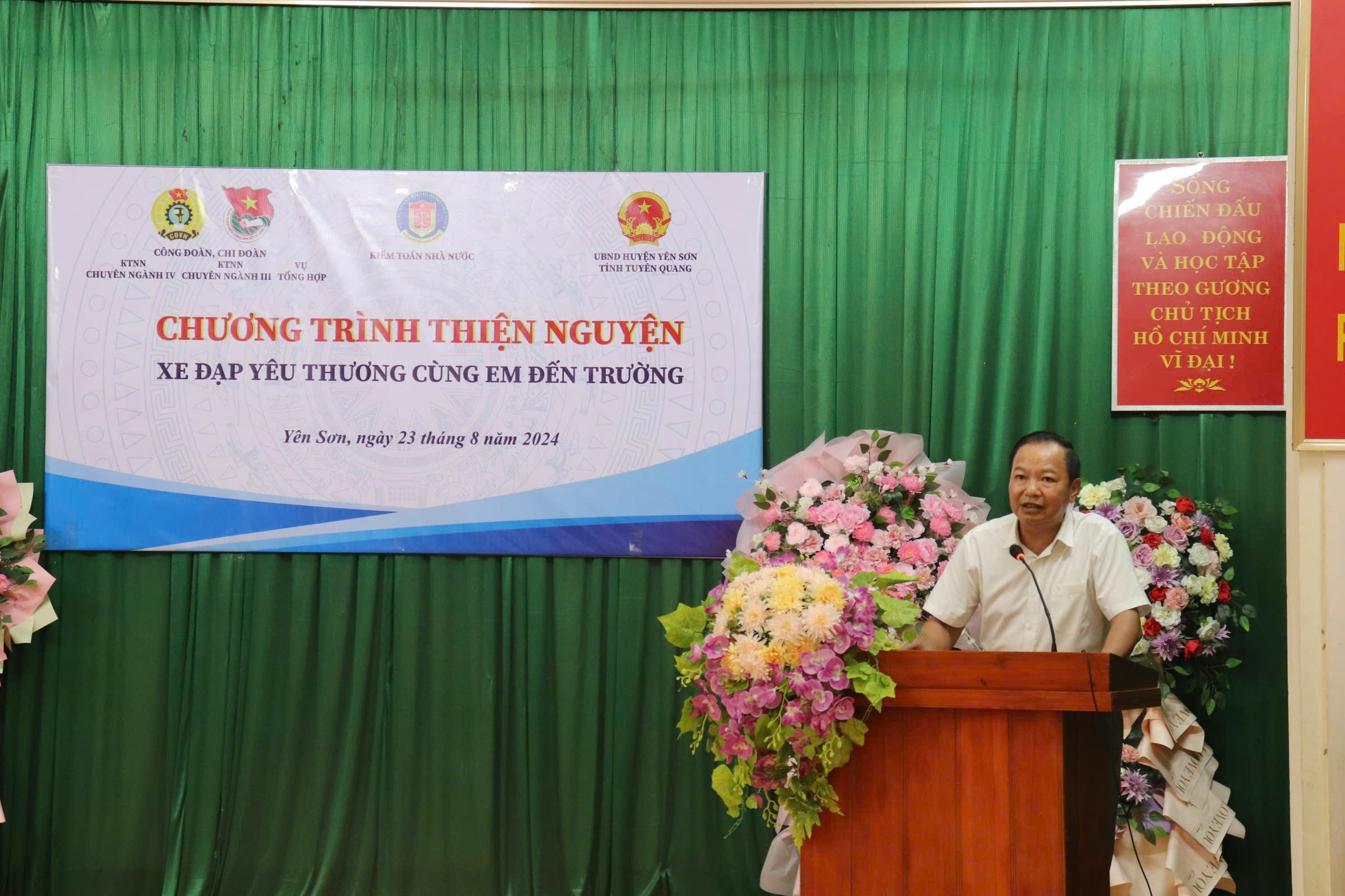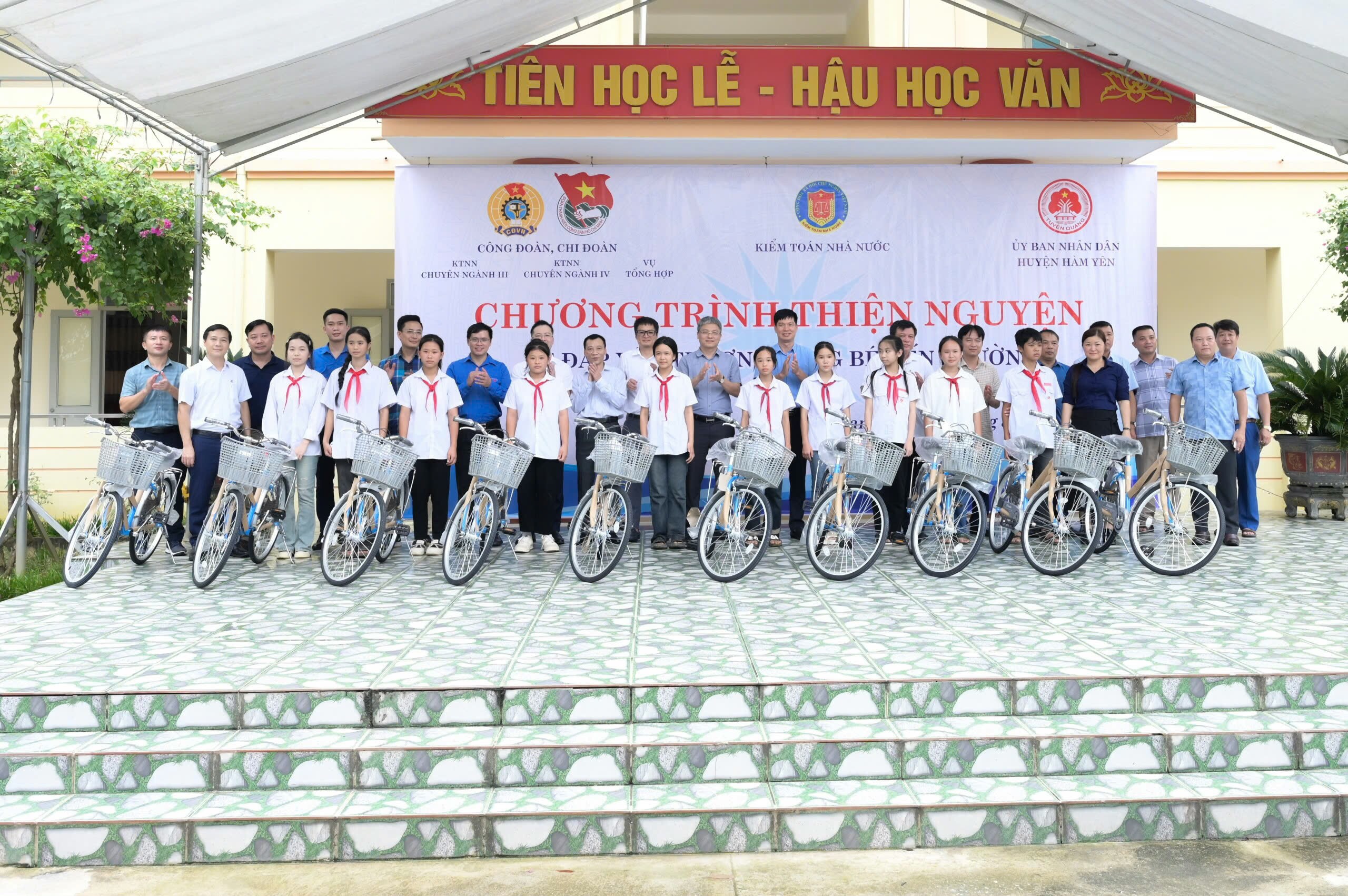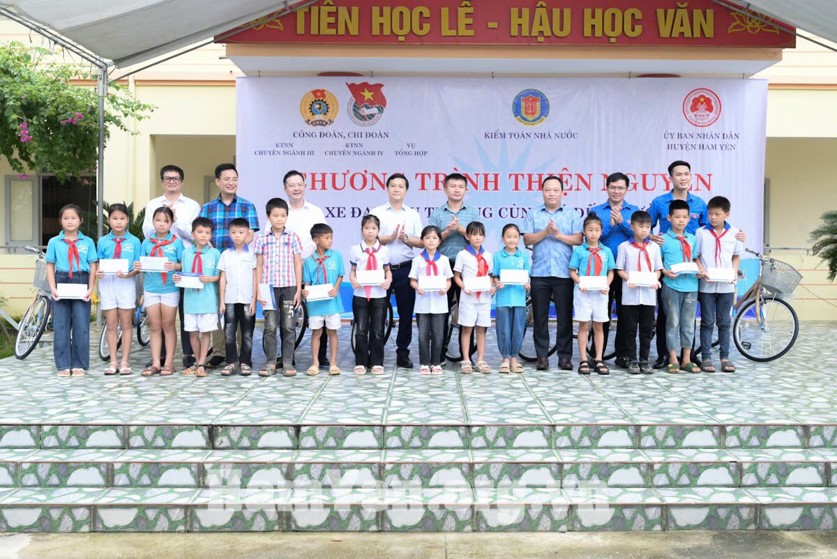 (sav.gov.vn) - Trong không khí hân hoan, phấn khởi chuẩn bị chào đón cho năm học mới 2024-2025, ngày 23/8, Công đoàn, chi đoàn Vụ Tổng hợp, Kiểm toán nhà nước (KTNN) chuyên ngành III, KTNN chuyên ngành IV đã phối hợp tổ chức chương trình “Xe đạp yêu thương - Cùng em đến trường” tại 03 huyện Sơn Dương, Yên Sơn và Hàm Yên thuộc tỉnh Tuyên Quang nhằm hỗ trợ, giúp đỡ các em học sinh có hoàn cảnh khó khăn nhất là học sinh ở vùng sâu, vùng xa, vùng đồng bào dân tộc thiểu số có phương tiện để đến trường.